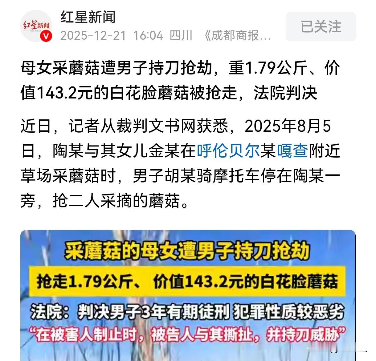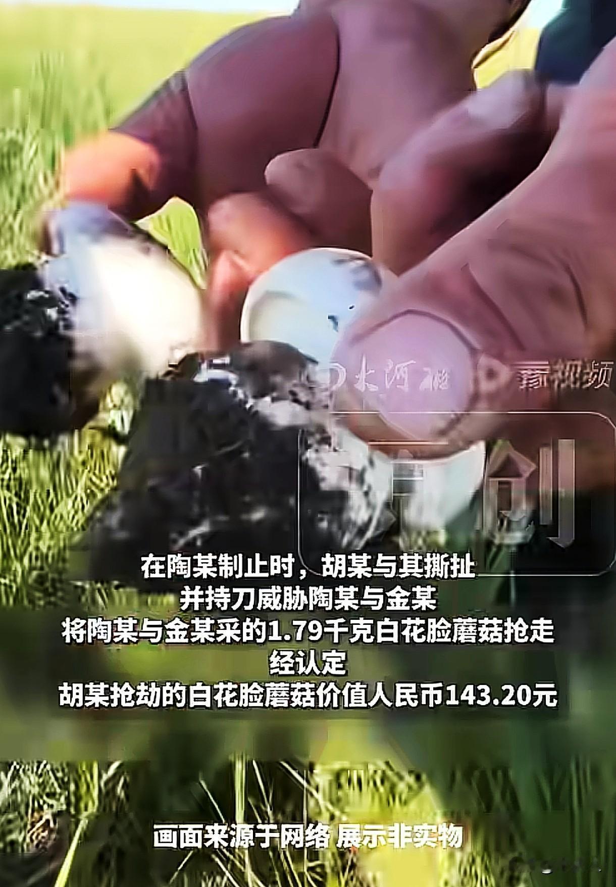 “一点都不冤!”内蒙古呼伦贝尔,男子看到母女二人在草场采了一些蘑菇,上前将蘑菇抢走,女子制止,男子持刀威胁女子,最终抢走女子母女1.79公斤白花脸蘑菇,经认定,蘑菇价值为143.2元。事后男子因抢劫罪被提起公诉,法院判决结果让他后悔莫及。 2025年8月5日,陶某趁着空闲时间,带着女儿小金一起去草场采蘑菇,蓝天白云,很是惬意。 就在母女二人专心采蘑菇的时候,一辆摩托车驶来,在她们附近停了下来。 摩托车上下来一名男子,看到陶某母女袋子里的白花脸蘑菇后,二话不说,伸手就去抢她们的篮子。 陶某被这突如其来的举动吓懵了,她本能地护住篮子,让对方想吃蘑菇就自己去找,这是他们母女采摘的,对方不能拿走。 可男子并未理会陶某的制止,继续用力拉扯,想把蘑菇抢走,双方发生撕扯。 男子见陶某不肯松手,有些恼羞成怒,竟然从身上掏出一把刀来,恶狠狠地对着陶某母女挥舞,并威胁他们,再不放手,就别怪他不客气了。 陶某被对方的举动吓得脸色苍白,为了保护自己和女儿,她只能松手。 陶某放手后,男子将他们母女二人辛苦采摘的蘑菇抢走,然后骑上摩托车扬长而去,只留下惊恐未定的陶某和小金。 看着男子远去的背影,陶某强忍恐惧和委屈,安慰女儿。 可她越想越气,这光天化日的,对方竟然敢持刀抢东西,她报了警。 警方展开调查,很快就找到了胡某,并查明胡某持刀抢走陶某母女1.79公斤白花脸蘑菇,经认定,蘑菇的价值为143.20元,虽然财物金额不大,但是胡某的行为性质十分恶劣。 胡某因抢劫罪被提起公诉。 法院审理认为,胡某持刀抢走他人财物,并且在抢走蘑菇的过程中,持刀威胁,对陶某母女的人身安全构成了严重的威胁,这种行为符合抢劫罪的构成要件。 最终,胡某因抢劫罪被判处有期徒刑3年,并处罚金2000元。 对于这个判决结果,有人表示不理解,他们认为胡某只是抢走了一点蘑菇,也就100来块钱,为什么会受到这么重的刑罚呢? 也有人说这都有人抢,这人是有多懒,在呼伦贝尔草场里,这种蘑菇很多的,他就是不想自己动手,只想不劳而获,活该被处罚。 这跟钱没多少关系,主要是持刀抢劫,一分钱跟一万元都是一样的,抢劫是重罪,法院判的没问题。 从法律角度来说,该如何看待胡某的行为呢? 《刑法》第263条规定:以暴力、胁迫或者其他方法抢劫公私财物的,处三年以上十年以下有期徒刑,并处罚金。 抢劫罪是指以非法占有为目的,当场使用暴力、胁迫或者其他方法强行劫取公私财物的行为。 抢劫罪是行为犯,其定罪核心在于当事人的行为本身是否否使用了足以压制被害人反抗的暴力、胁迫或其他方法,而非财物价值。 只要行为人实施了以暴力、胁迫或其他方法劫取公私财物的行为,不论实际抢得财物数额多少,均构成抢劫罪。 在这起案件中,胡某使用了刀具对陶某母女进行威胁,属于以胁迫的方法抢劫公私财物,符合抢劫罪的构成要件。 这种抢劫行为不仅侵犯了被害人公私财物的所有权,还严重危及公民的人身安全,具有极大的社会危害性。 因此,即使抢劫的财物价值不大,但是只要使用了暴力、胁迫等手段,就会受到法律的严惩。 在日常生活中,一定要遵纪守法,尊重他人的劳动成果。 千万不要去威胁他人,向他人索要财物,抢劫是重罪,3年起步,入室抢劫10年起步。 任何企图通过不正当手段获取财物的行为,都需要付出相应的代价。 对于此事,大家怎么看? 关注@木头人 ,从法律角度看世界,感受不一样的人情冷暖。