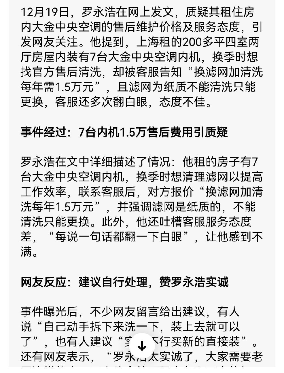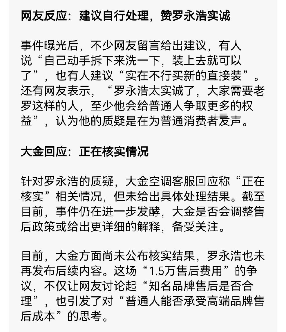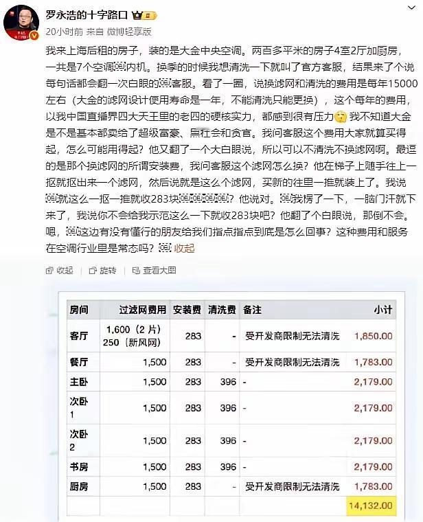 罗永浩这个人,我个人觉得他还是很不错的。现在的他前面硬刚预制菜,现在吐槽电信网速,据说被他教育后,他家的电信网速快的吓人,他得了便宜还卖乖,感叹什么时候如果普通人找客服也是这样的效果才是本心! 可惜这种情况永远不可能,至少我对这些大企业没有这个信心。 据说罗永浩下一步要帮助的是大金空调,我怀疑大金专业清洗团队说不定已经在罗永浩住处免费干上了!这世界就是这样的,硬刚这些个宵小,他们才会重视客户的体验! 大金空调这个漫天要价的服务团队我怀疑极有可能是外包,这些人很会看菜下筷子,可能他们早就知道用大金空调的都是有钱人,没有几个有钱人会为了万把块失去自己的体面!他们大概率吃油了嘴,没想到碰到个精打细算不要虚头巴脑面子较真的罗永浩。而且这些个服务人员都没见过啥世面,连网络上铜豆子罗永浩都不认识,还想宰人家,动不动对人翻白眼!可谓夜路走多了,终于遇到厉害的了! 希望罗永浩闹腾这么几次,能够稍微改善一下商家服务的意识!