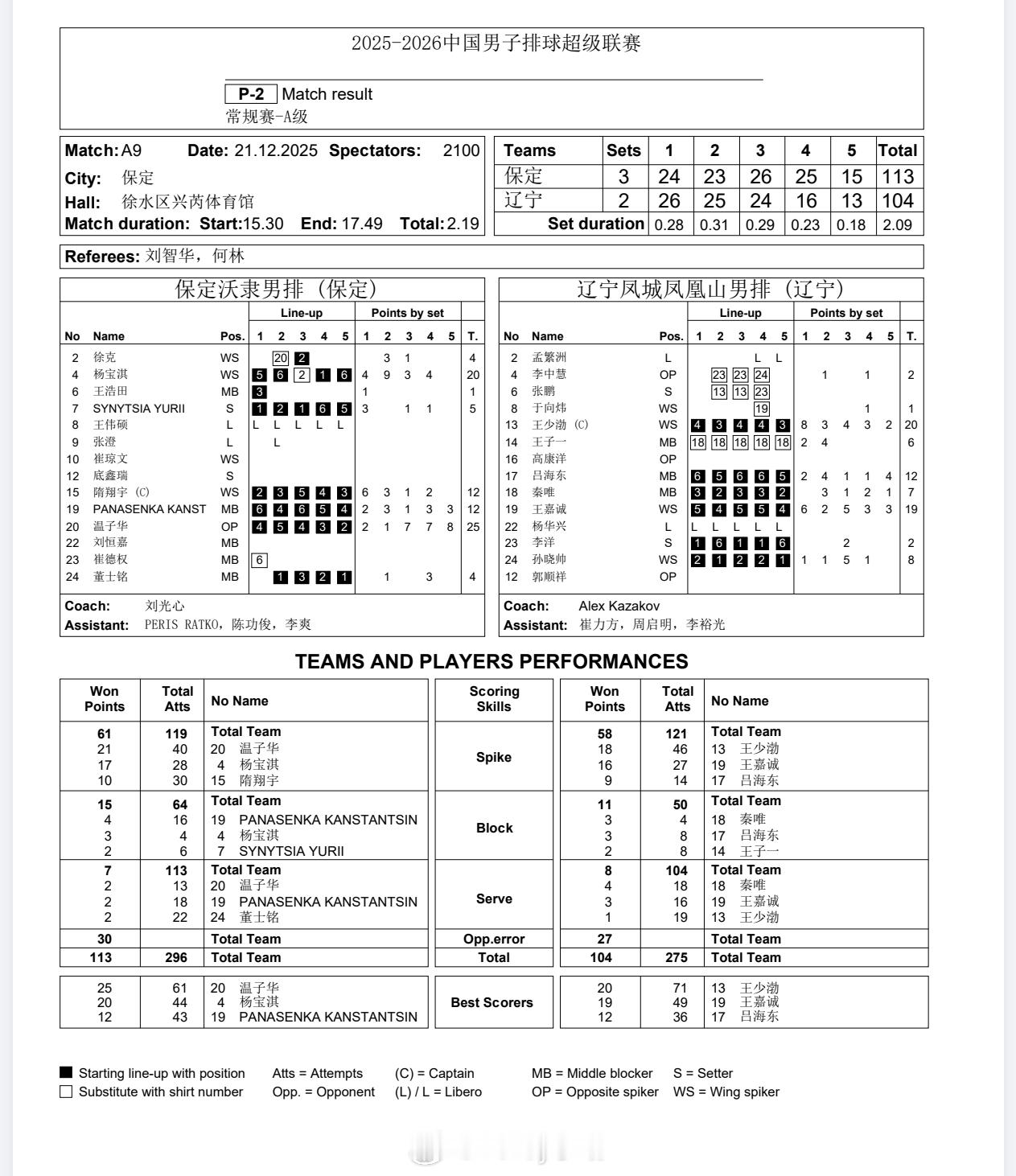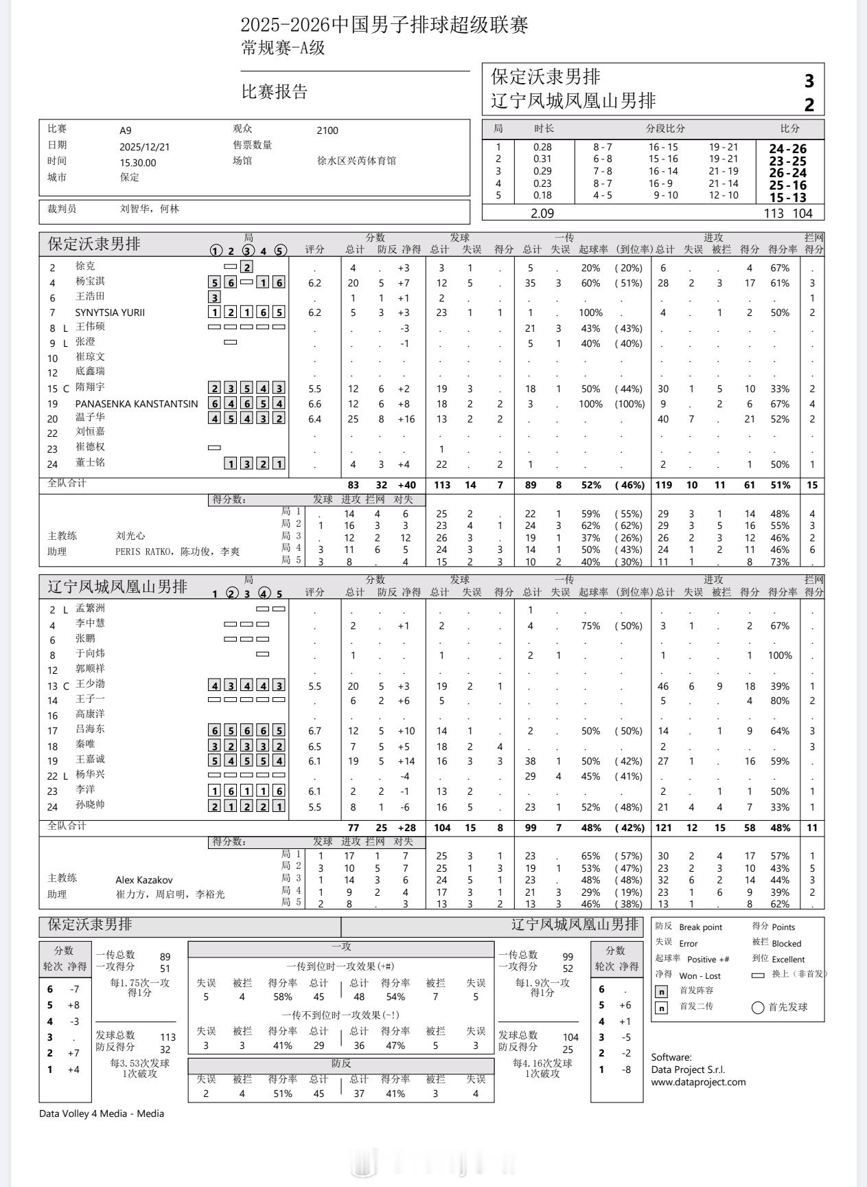 【技术统计】河北男排3比2辽宁男排(24-26 23-25 26-24 25-16 15-13)排超联赛2025-2026中国排球超级联赛
