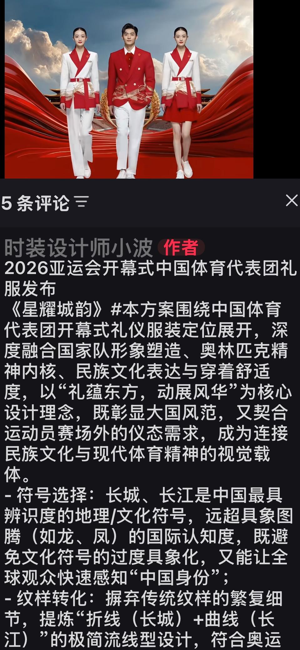 2026年亚运会开幕式中国体育代表团礼服发布——投票中 想看王楚钦穿上礼服, 一定比模特更帅, 你要相信高奢的眼光! 衣服没有能适合所有人, 通过定制,可以尽量做到合体, 设计要考虑运动员的体型, 会根据运动员的体型进行调整, 女模特很瘦, 希望设计师能够考虑到 女运动员的手臂比较粗壮有力, 肩比较宽的细节, 不然西服穿上就会出现肩宽尺寸合适,衣服袖子过长的问题! 女运动员的礼服没有腰带 改新中式,腰封这里改盘扣比较好! 女运动员可以选择裙子或者裤子, 这一点真正为运动员考虑到了, 已投票,加油!