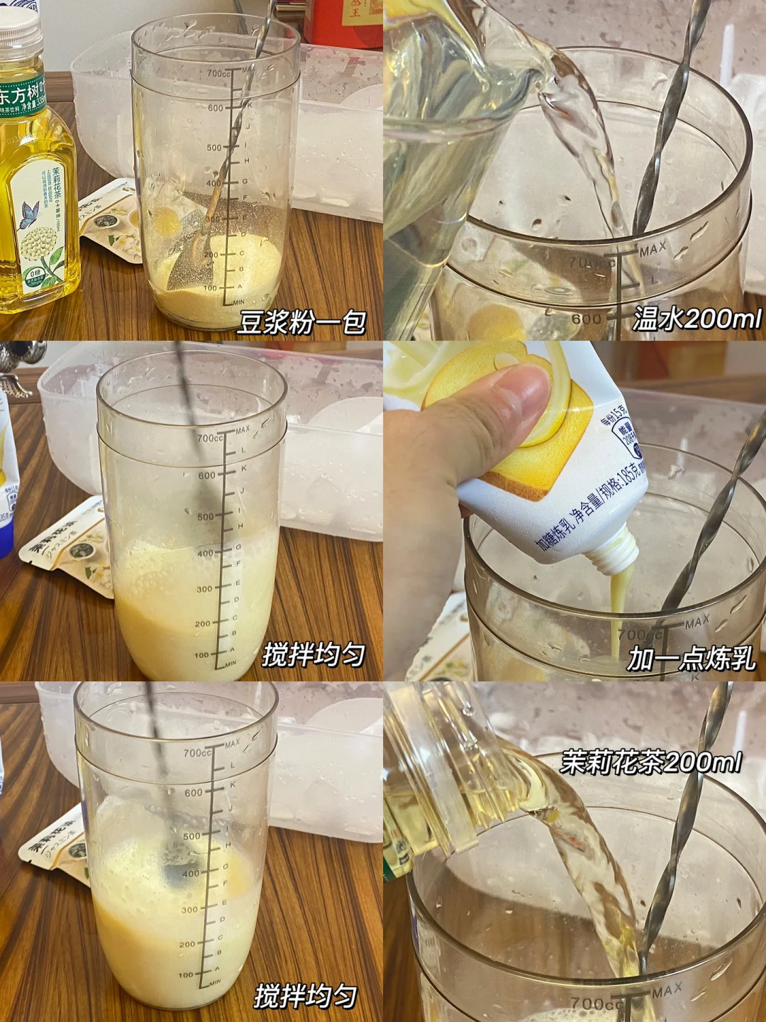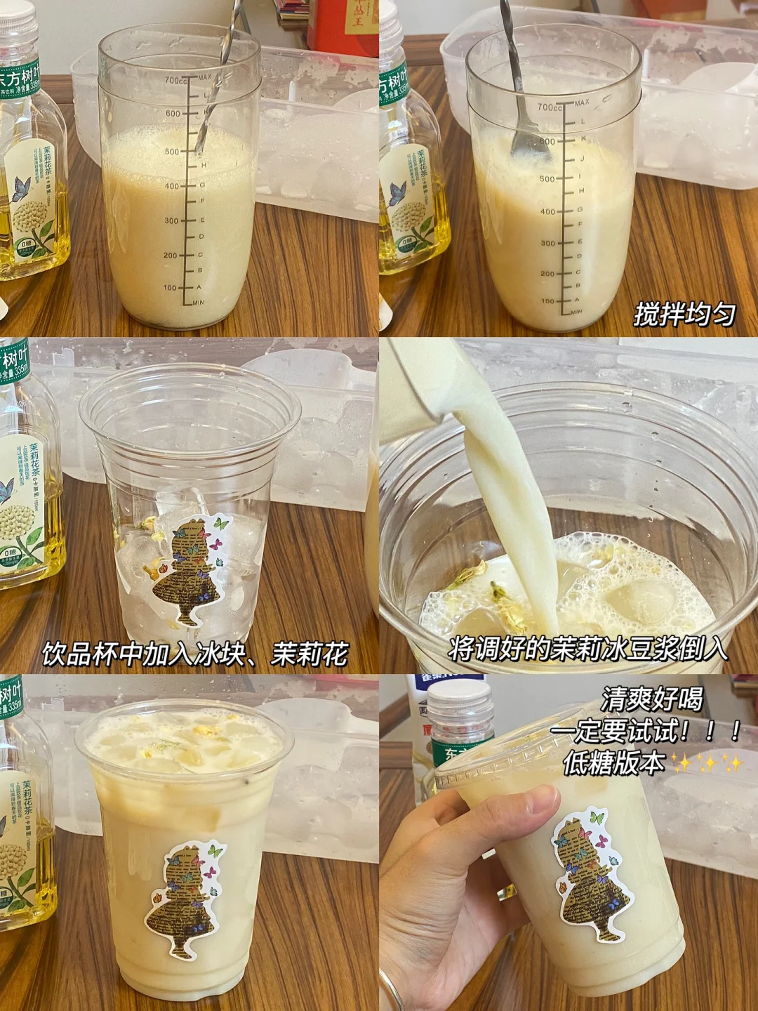 🌷食材:豆浆粉,茉莉花茶,炼乳,冰块。 🌷做法:1.雪克杯中倒入豆浆粉,加温水搅拌均匀。 2.倒入茉莉花茶、炼乳搅拌均匀。 3.饮品杯中加冰、茉莉花,倒入茉莉冰豆浆。 🌷清爽好喝,低糖版本,姐妹们一定要试试[赞R][赞R][赞R]