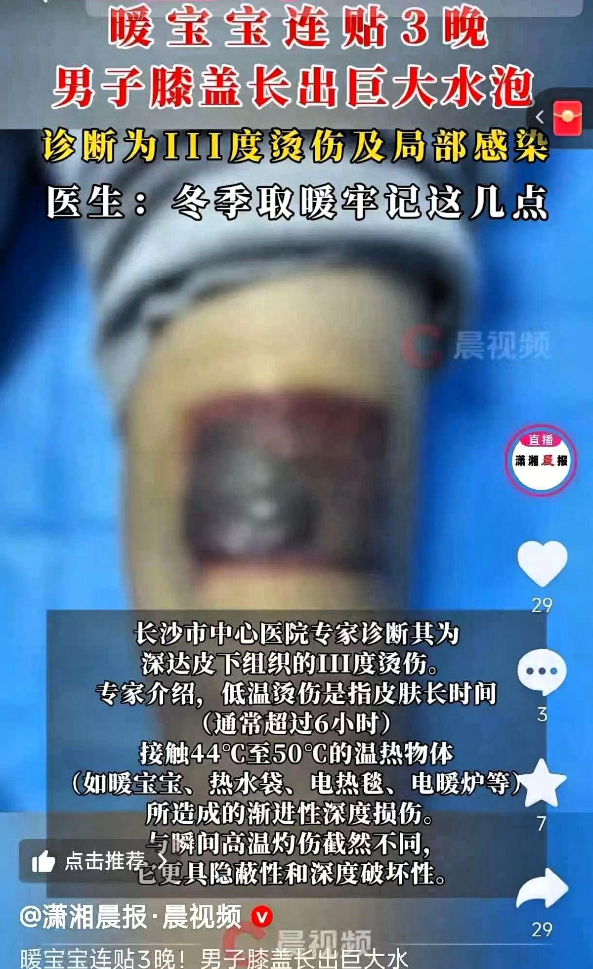 悲剧还是发生了!湖南长沙的张先生,一到天冷老寒腿就犯疼。为了缓解不适,他直接把暖宝宝贴在膝盖皮肤上,连着三晚贴着睡觉。 前两晚用完没觉得皮肤有异样,还觉得膝盖疼痛感减轻了,便放松了警惕。结果第三天,膝盖处鼓出一个巨大水泡,疼得他连弯腿都费劲,赶忙去医院就诊。 医生诊断为典型的低温烫伤,且已达到Ⅲ度,皮下组织出现坏死,后续需要清创、定期换药,配合抗生素控制感染,精心护理才能愈合。 千万别觉得暖宝宝温度不高就没危险,它的可怕之处在于“低温陷阱”。暖宝宝温度通常维持在40-50℃,摸起来温温的,却会像文火慢炖一样,持续向皮肤深层传递热量。 皮肤表层适应温度后,初期只有轻微麻木感,没有明显灼痛感,等发现水泡、疼痛难忍时,损伤早已深入皮下组织。 使用暖宝宝的几个误区一定要避开:绝对不能直接贴皮肤,必须隔一层薄衣服;单次使用不超2小时,同一部位别反复连续贴;切勿贴着睡觉,睡眠中对温度感知迟钝,风险会翻倍。老人、糖尿病患者、婴幼儿对温度敏感度低,使用时最好有家人在旁留意皮肤状况。 若不慎低温烫伤,别涂牙膏、酱油等偏方,这些会加重感染。正确做法是用流动凉水冲洗或凉毛巾冷敷降温,起了水泡别自行挑破,用干净纱布盖住创面,尽快就医。 冬季取暖本是为了舒服,可别因疏忽让取暖好物变成伤人利器。安全永远是第一位的,掌握正确用法才能暖身又安心。