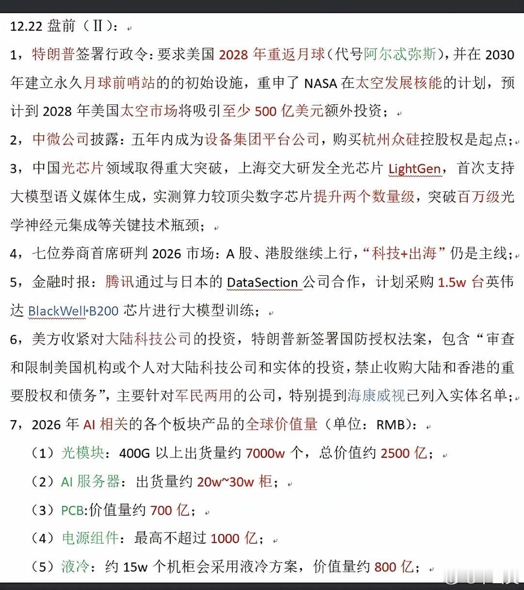 12.22周一盘前 财经热点汇总!1.特朗普签署太空商业发展计划2.中国光芯片技术获得突破!3.腾讯计划购买英伟达芯片4.美方收紧对大陆科技公司投资5.2026,AI产品爆发