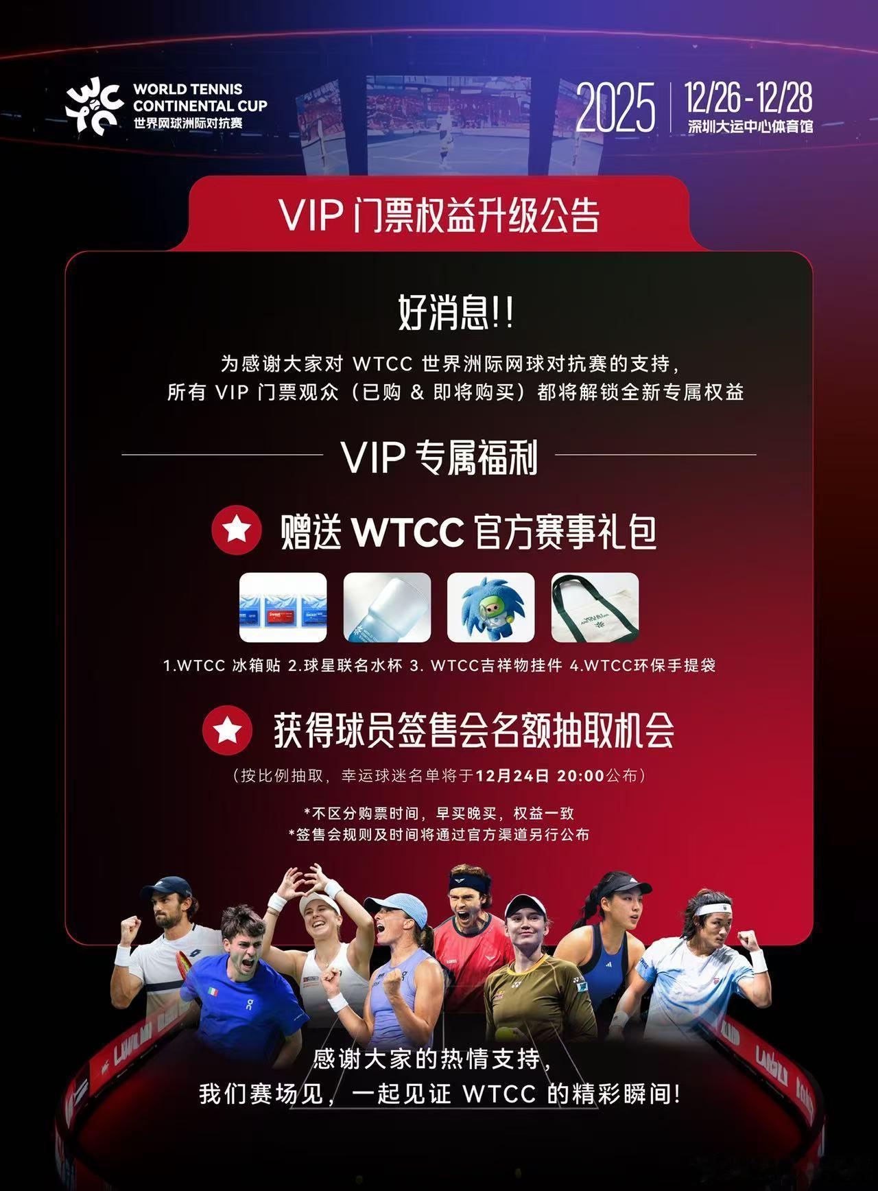 又一波福利来啦!说出你想看的球星,我将在23号抽出10位幸运球迷,各送出球票一张(场次不定,一定要在深圳哦)!今年门票VIP权益也升级了!WTCCWTCC世界网球洲际对抗赛你我皆是主角 抽奖详情