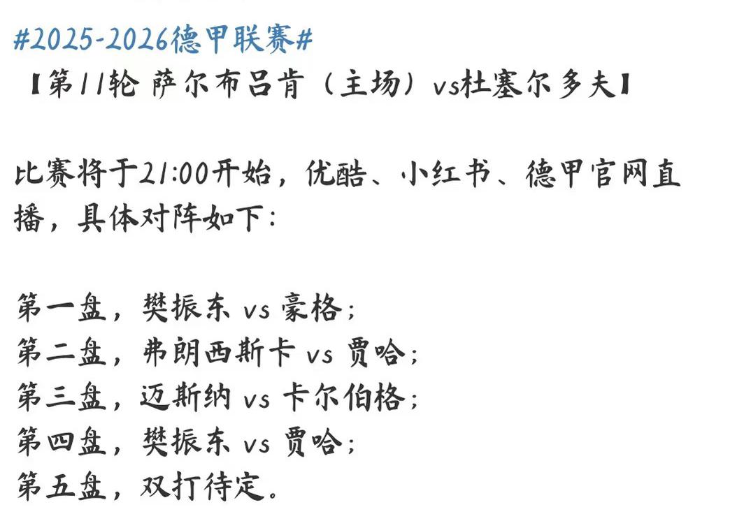 12月21日樊振东德甲3:1贾哈 一单二分——不愧是T0级选手 波尔现场解说又帅又绅士 德甲第十一轮焦点大战, 萨尔布吕肯2:2杜塞尔多夫, 第一盘,樊振东3:0豪格, 11:2,11:5,12:10, 第二盘 弗朗西斯卡2:3贾哈, 11:4,4:11,6:11,11:9,8:11, 第三盘 迈斯纳2:3安东卡尔伯格 8:11,13:15,12:10,12:10,8:11 第四盘樊振东3:1贾哈 11:3,6:11,11:5,11:5 第五盘 弗朗西斯卡/迈斯纳3:1卡尔伯格/李永胤 樊振东与贾哈在巴黎奥运会 男单1/8决赛中交手过, 当时贾哈0:4樊振东, 不过这一次, 贾哈涨球了, 特别是这个超高的高抛发球, 特别具有威胁性! 樊振东不愧是理科状元的儿子, 迅速解题,利用逆旋转发球, 改变发球落点,拿下贾哈! 太棒了樊振东, 就看第五盘,弗朗西斯卡/迈斯纳 的男双啦, 加油萨尔布吕肯!