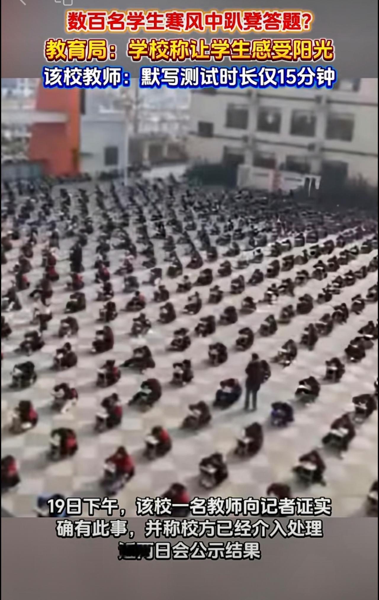 数百名学生寒风中趴凳上答题?教育局:学校称让学生感受阳光,该校教师:默写测验时长仅15分钟。