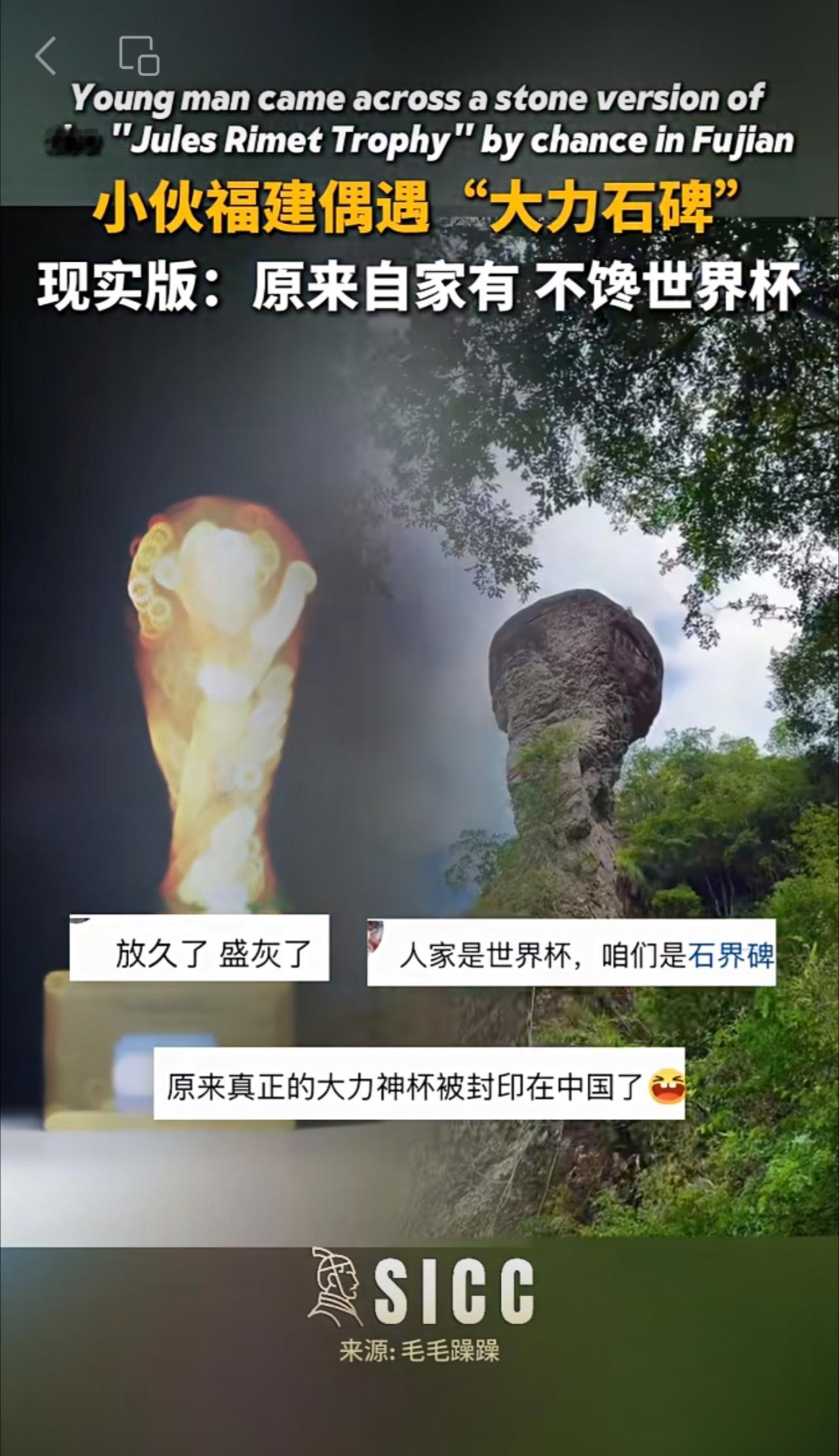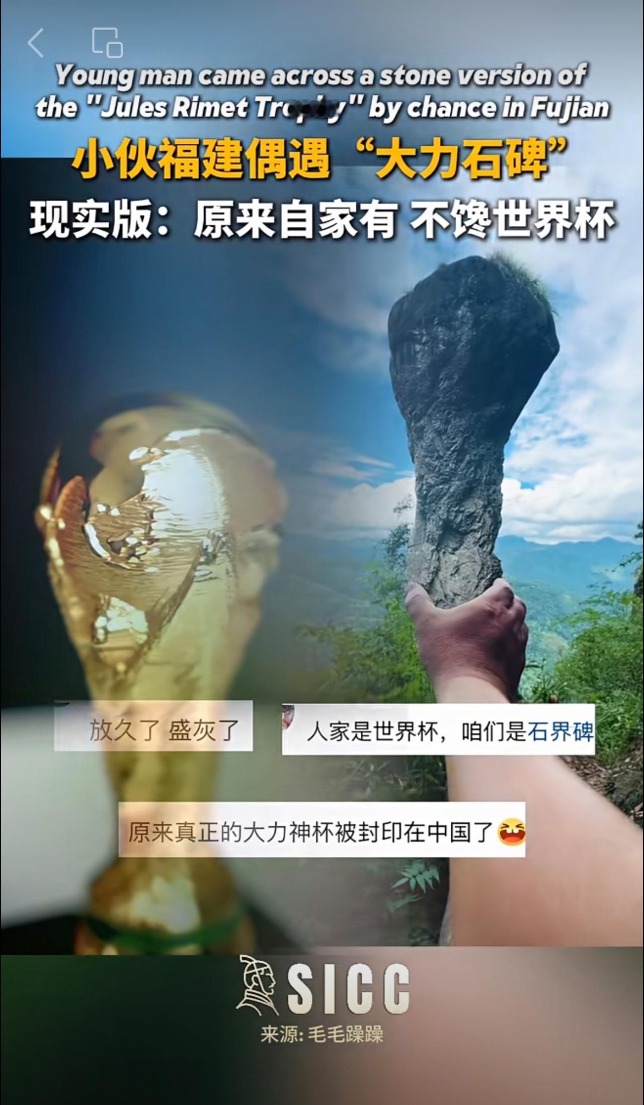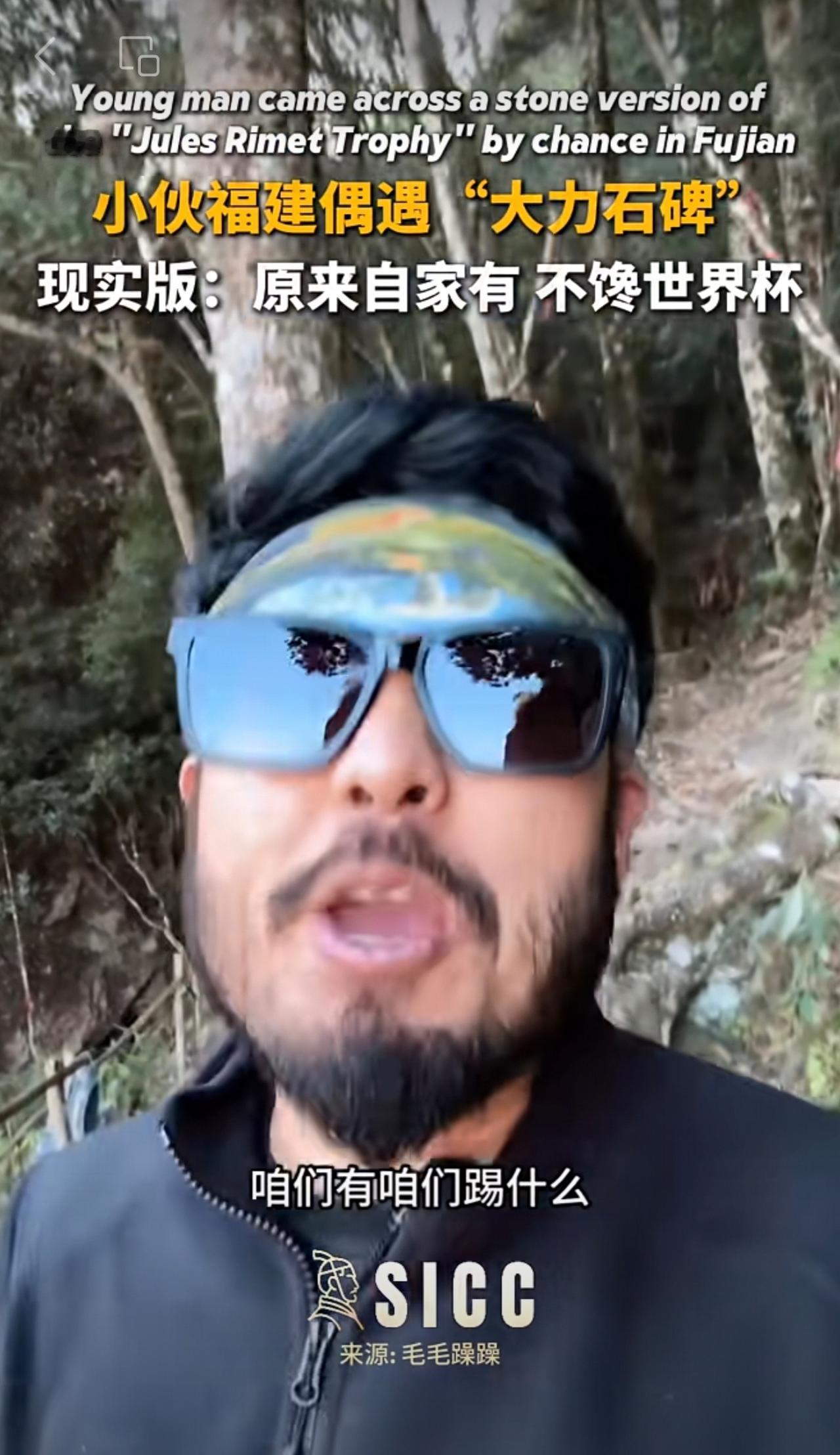 小伙福建偶遇“大力石碑” 现实版:原来自家有 不馋世界杯 Young man came across a stone version of the "Jules Rimet Trophy" by chance in Fujian.
