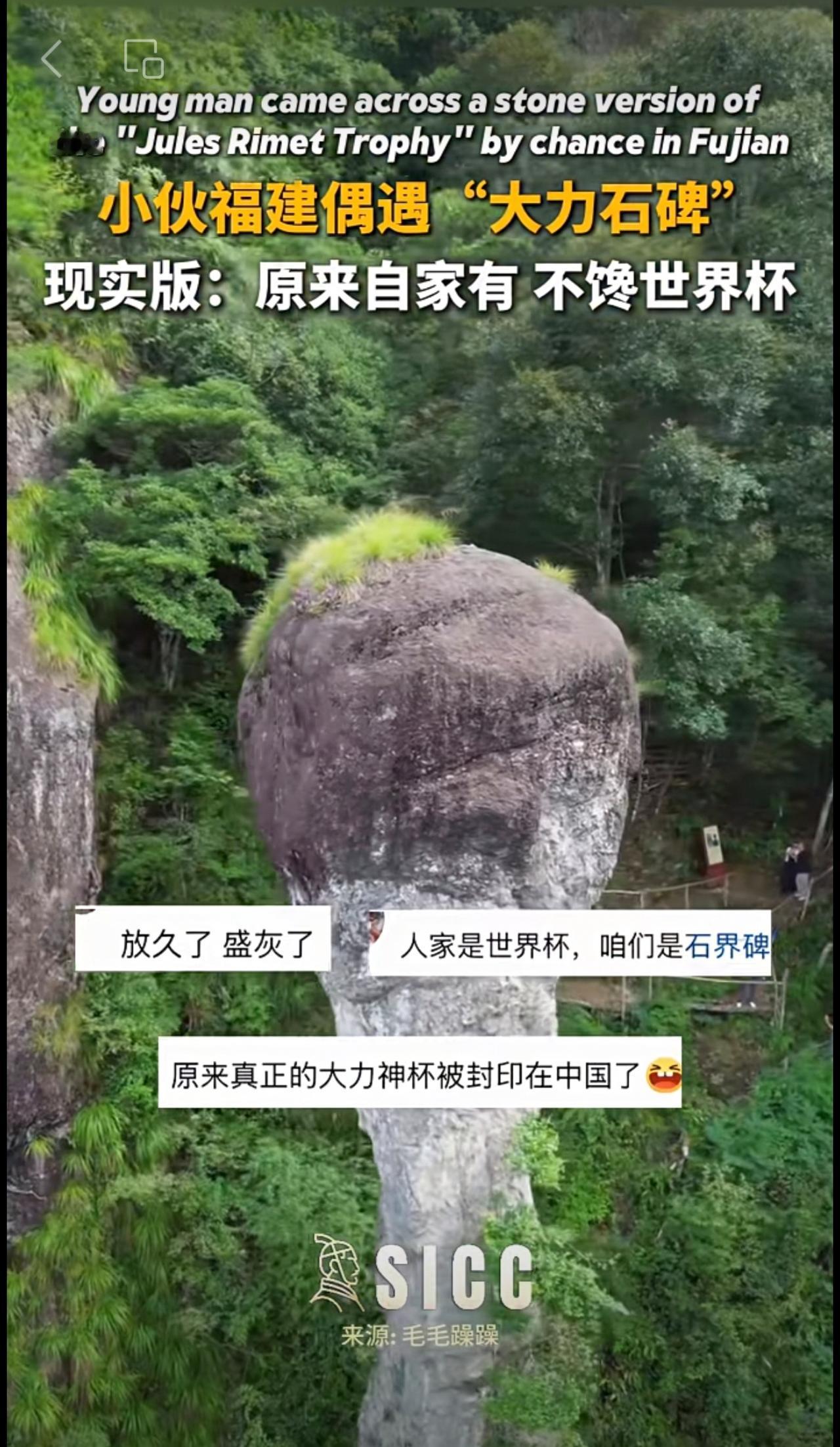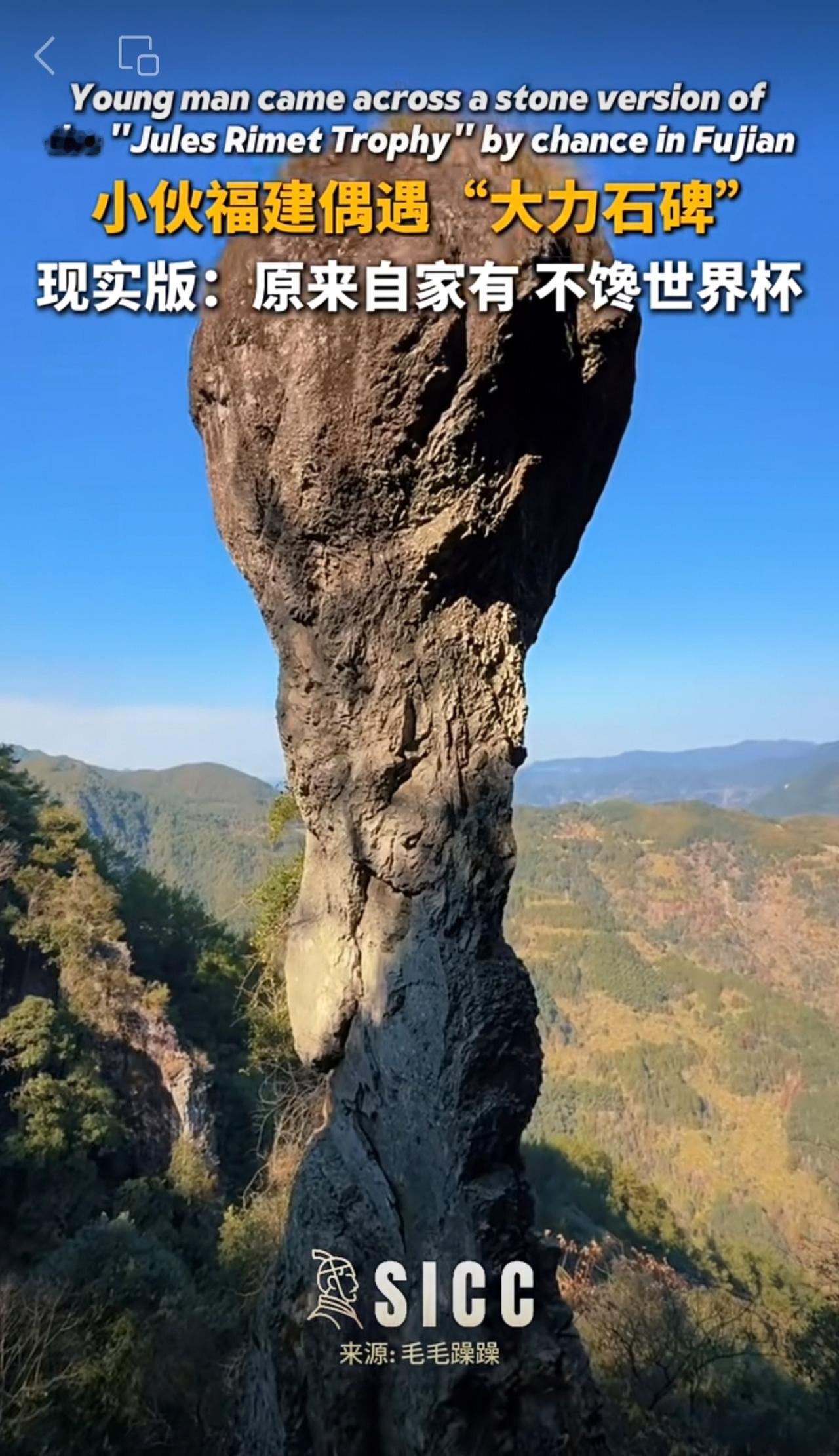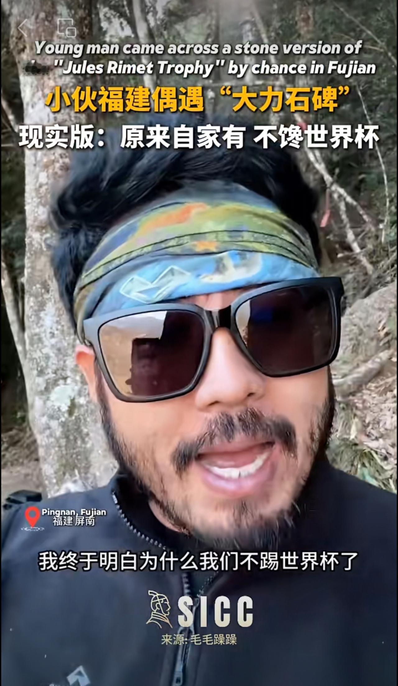 小伙福建偶遇“大力石碑” 现实版:原来自家有 不馋世界杯 Young man came across a stone version of the "Jules Rimet Trophy" by chance in Fujian.