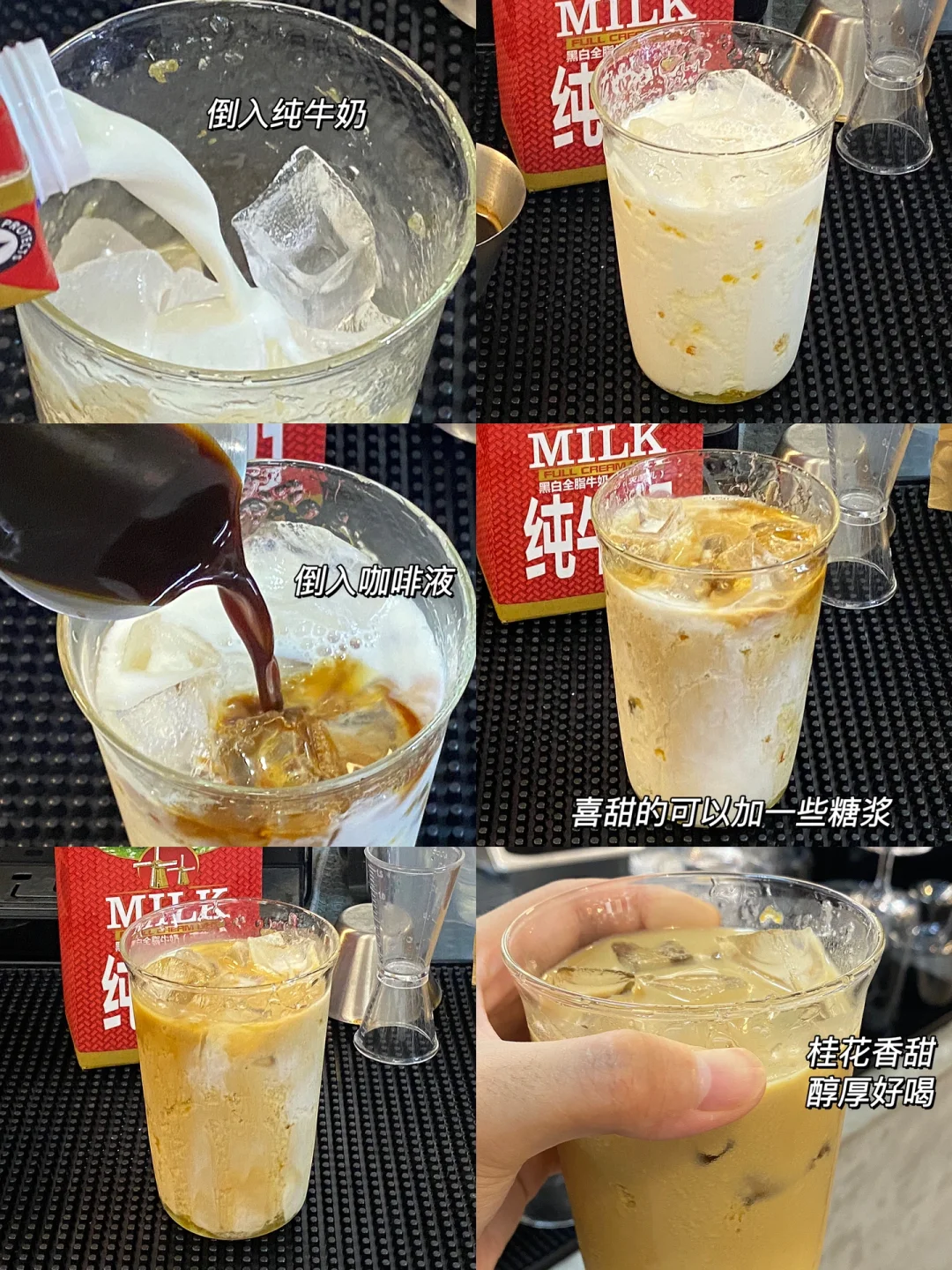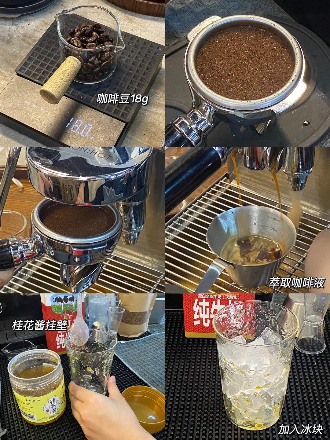 🌷食材:咖啡液(建议用现磨的咖啡豆)桂花酱(一定要放,挂壁)纯牛奶(可以用水牛奶,奶味会更香醇)冰块。 🌷做法:1.准备一个喜欢的玻璃杯或者饮品杯,桂花酱打底、挂壁。 2.加入冰块,加入纯牛奶至8分满。 3.缓慢倒入萃取好的咖啡液,会分层(喜甜的可以加一些糖浆) 4.家里如果有干桂花的也可以撒一些,点缀一下会更好看! 🌷喝之前记得搅拌一下,让桂花香与奶香充分融合,入口是苦中带了一丝丝的甜,很醇厚的味道!赶紧试试吧[赞R][赞R][赞R]