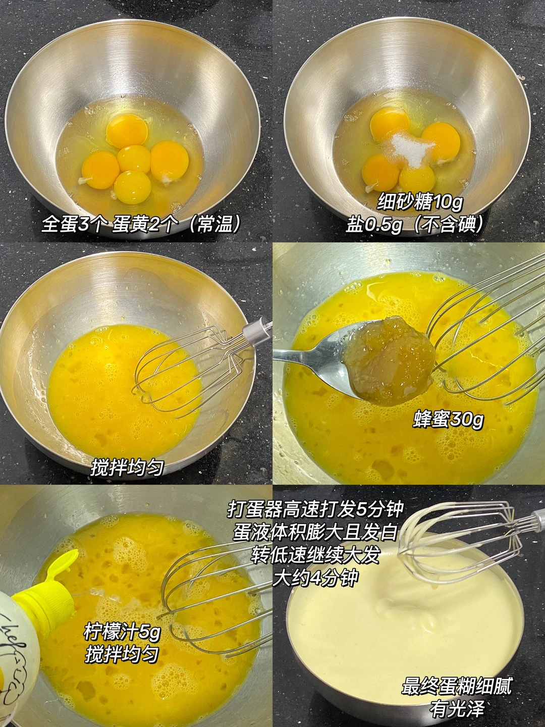 🌷做法:1.全蛋、蛋黄、细砂糖、盐搅拌均匀,再加入蜂蜜、柠檬汁搅拌均匀。