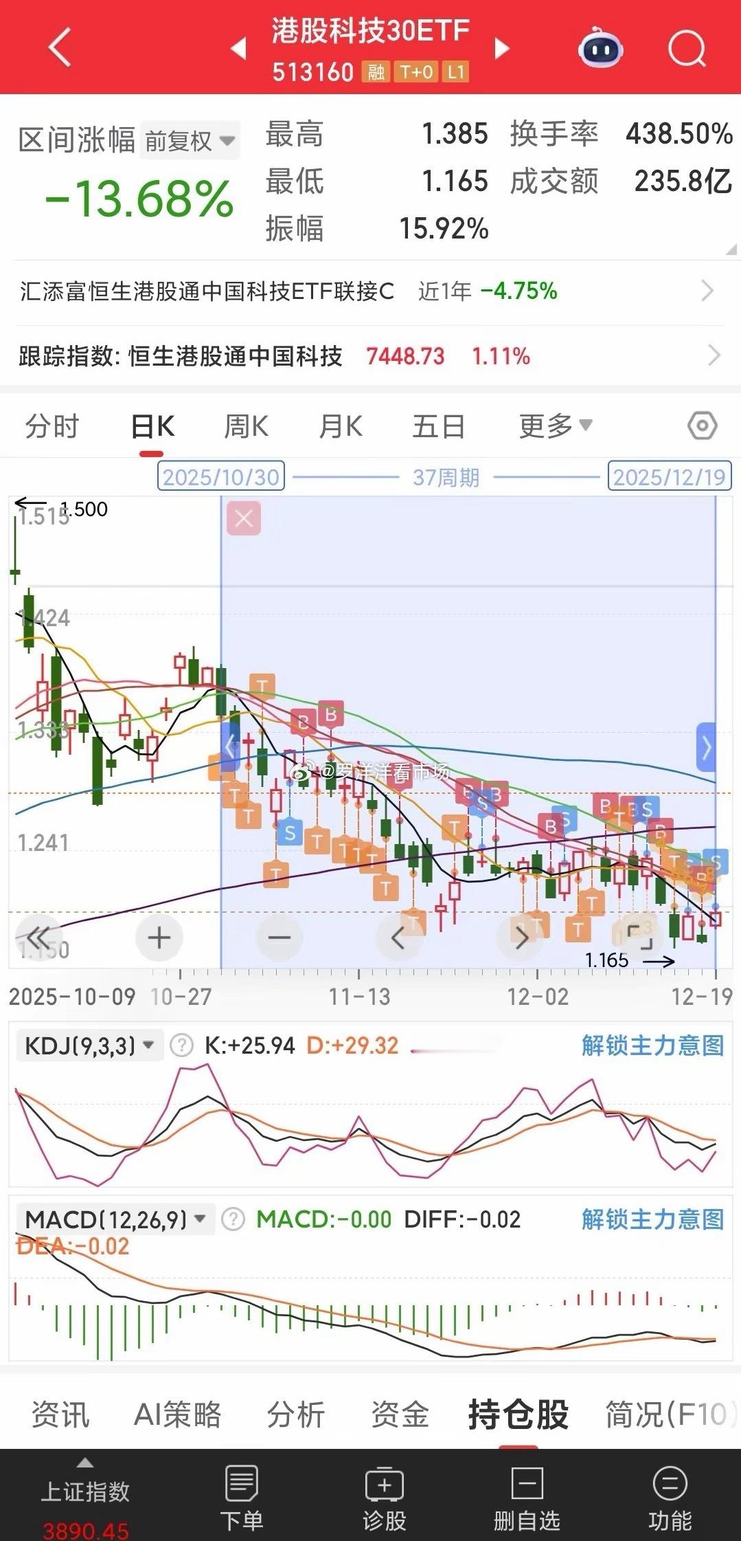科技虽然我一直看好,但短期还是不能扭转颓废的局面,特别是外围时不时唱空科技,导致港股科技30自10月30日建仓以来,已经下跌了13.68%,而我目前持有也跌了8%,不过,我并没有因此而慌乱。在投资的世界里,短期的波动本就是常态,科技行业更是如此,它的发展速度快、变化大,市场情绪的影响也更为明显。那些外围的唱空声,其实更多是短期的噪音,从长远来看,科技行业的发展潜力依然巨大。科技是推动社会进步的核心力量,无论是人工智能、大数据,还是新能源、生物医药等领域,都有着广阔的发展前景。随着人们对科技的依赖程度越来越高,科技企业的市场空间也在不断扩大。而且,国家也在大力支持科技行业的发展,出台了一系列的政策来鼓励创新和创业,这为科技企业的成长提供了良好的环境。我相信,现在的下跌只是暂时的,是市场在进行自我调整。等这一波调整结束后,科技行业有望迎来新的上涨行情。我打算继续持有手中的科技股,并且在合适的时机,还会考虑适当补仓。毕竟,投资是一场长跑,不能被短期的波动所左右,要有长远的眼光和坚定的信念。我期待着科技行业再次崛起的那一天,到时候,我的坚持一定会得到丰厚的回报。