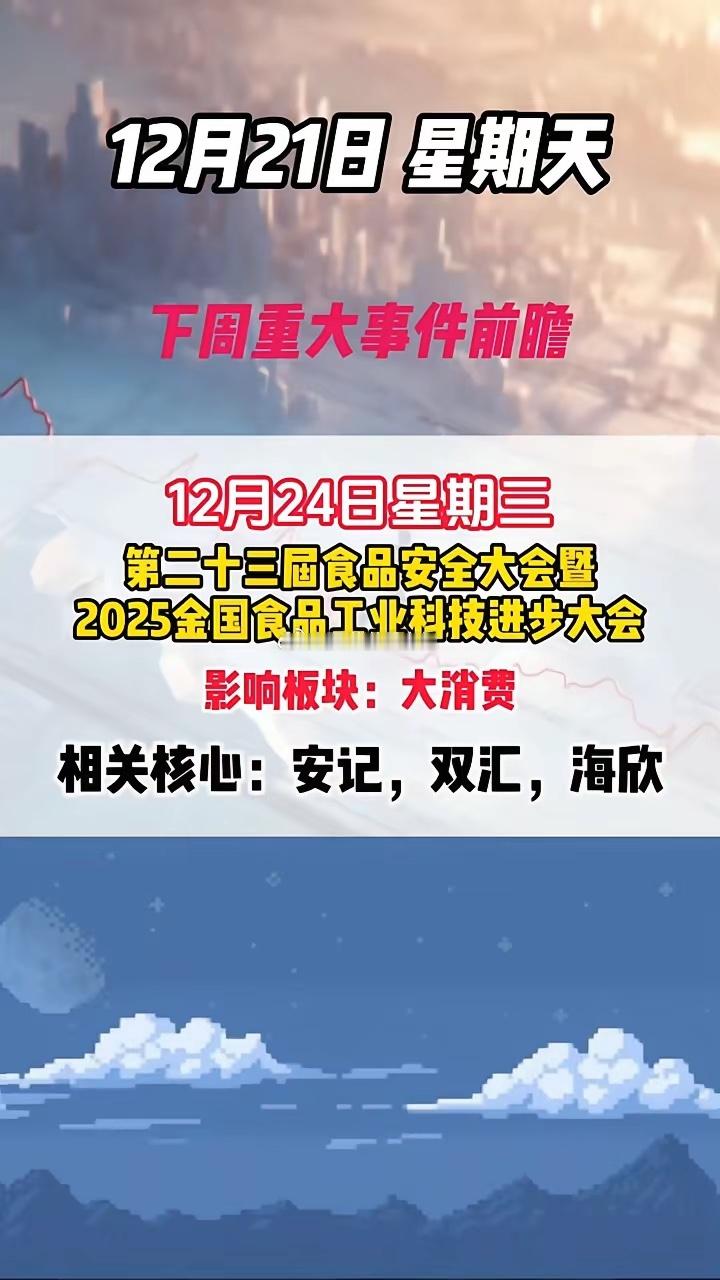下周重大事件前瞻。热点榜单核心精选。·12月22日星期一:首届全球博鳌金融大会,影响板块:多元经济,相关核心:鲁信、九鼎、五矿。同日世界显示产业大会,影响板块:光电光学,相关核心:盛洋、彩虹、京东方。·12月23日星期二:2025年工业绿色低碳发展大会,影响板块:新能源,相关核心:通威、宁德、隆基。·12月24日星期三:第二十三届食品安全大会暨2025全国食品工业科技进步大会,影响板块:大消费,相关核心:安记、双汇、海欣。·12月25日星期四:圣诞节消费高峰期,影响板块:大消费,相关核心:东百、百大、永辉。·12月26日星期五:第十二届全国大众冰雪季,影响板块:冰雪经济,相关核心:雪人、晶雪、中体。