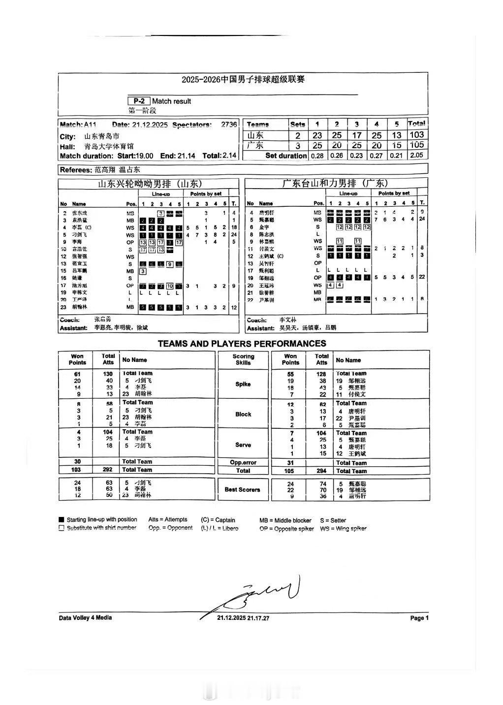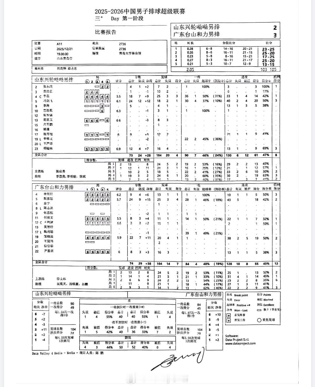 【技术统计】青岛兴轮呦呦2比3广东台山和力(23-25 25-20 17-25 25-20 13-15)排超联赛2025-2026中国排球超级联赛