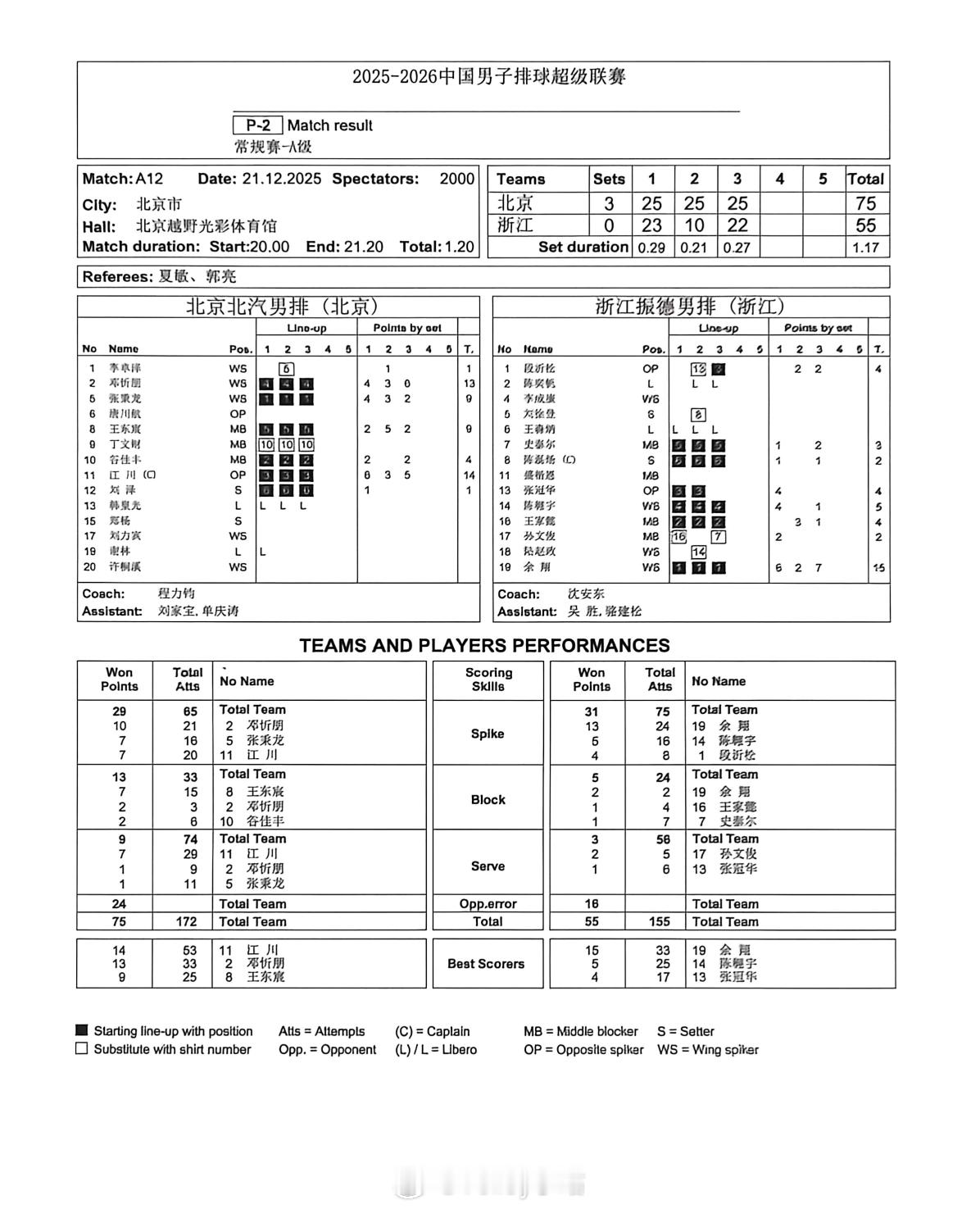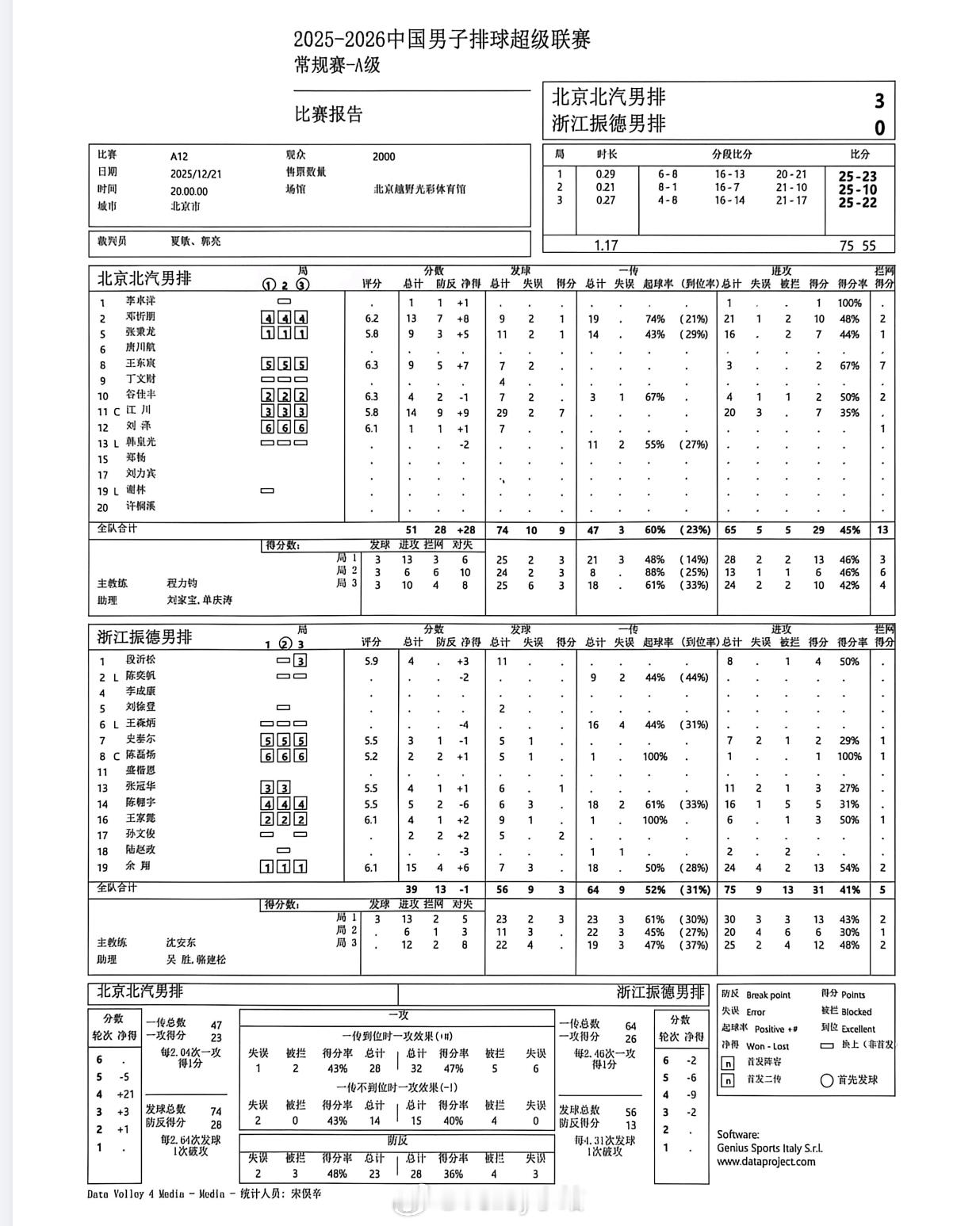 【技术统计】北京北汽3比0浙江振德(25-23 25-10 25-22),江川单场7发排超联赛2025-2026中国排球超级联赛
