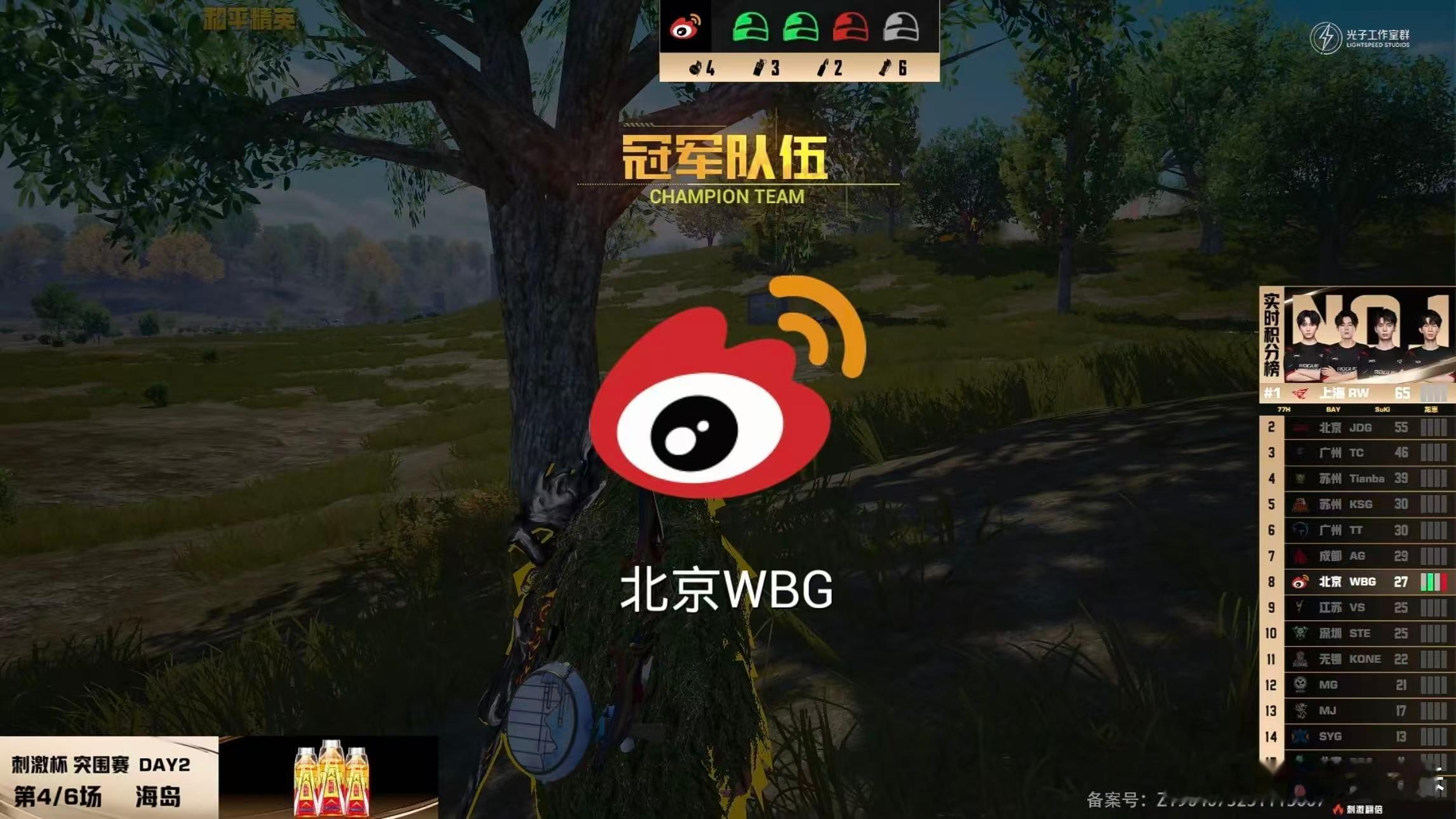 WBG刺激杯12淘汰吃鸡 这把WBG打得又稳又狠,前期运营找节奏,后期决赛圈抓住圈形和人数优势,一波带走独狼,12淘汰吃鸡入账,积分榜第八,期待沙漠图再续火力。