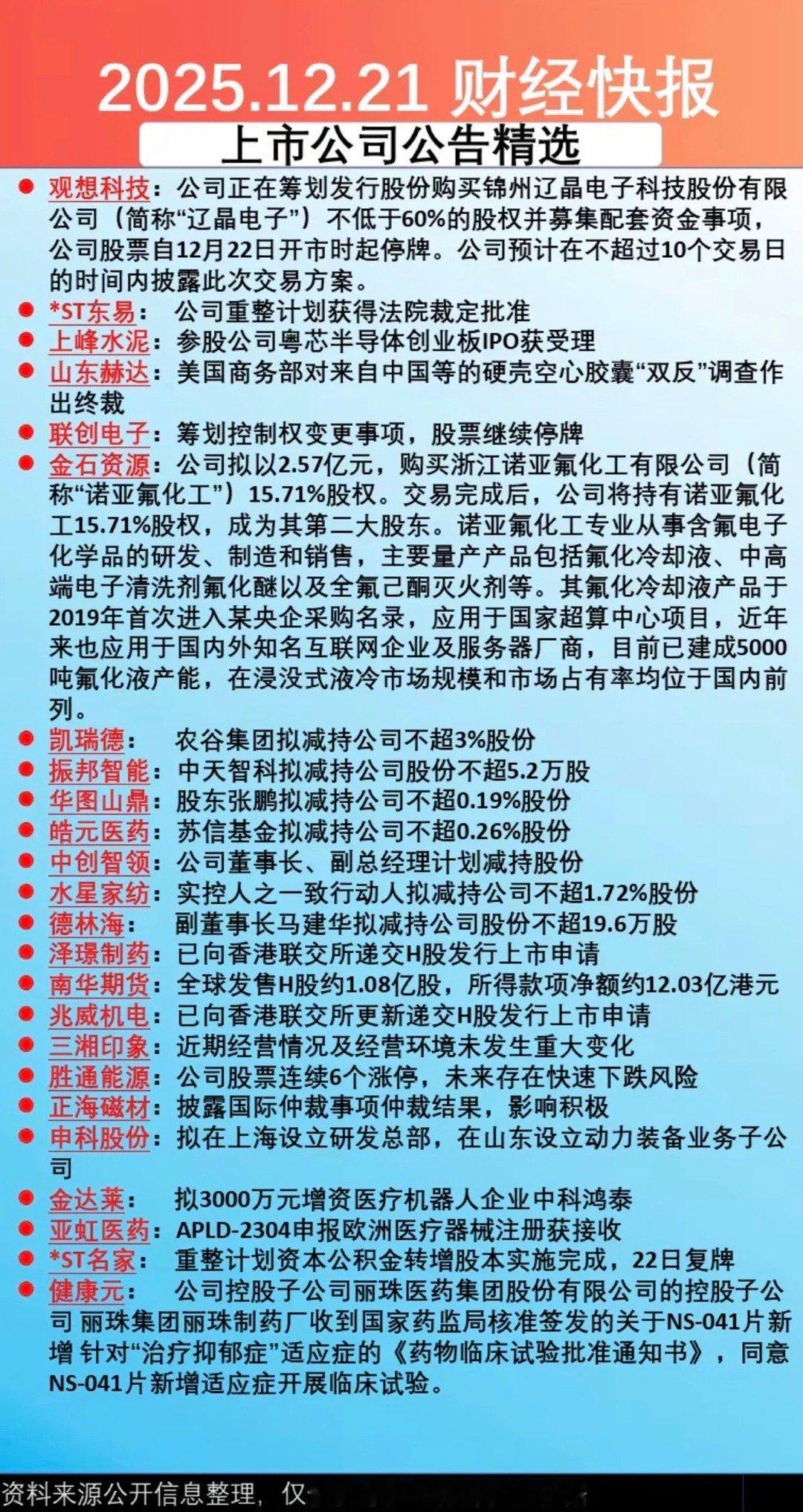 12.22周一 最新:上市公司公告精选!公告汇总:停复牌,重整消息,收购股权,H股上市申请,企业仲裁,多家公司披露减持,设立下属子公司,公积金转增资本等