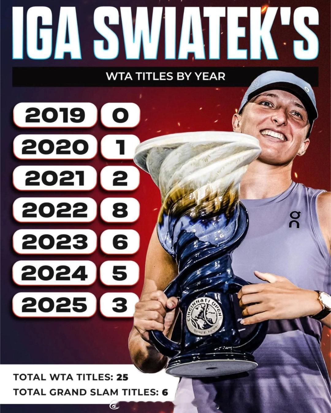 伊加·斯瓦泰克冠军年表🏆从2019年首冠起步,到2025年持续收割她的夺冠之路清晰而有力👇2019 🏆2020 🏆🏆🏆🏆2021 🏆🏆2022 🏆🏆🏆🏆🏆🏆🏆🏆2023 🏆🏆🏆🏆🏆🏆2024 🏆🏆🏆🏆🏆🏆🏆2025 🏆🏆🏆📊 职业生涯至今✅ WTA单打冠军总数:25✅ 大满贯冠军总数:6网球talking大会网球wta