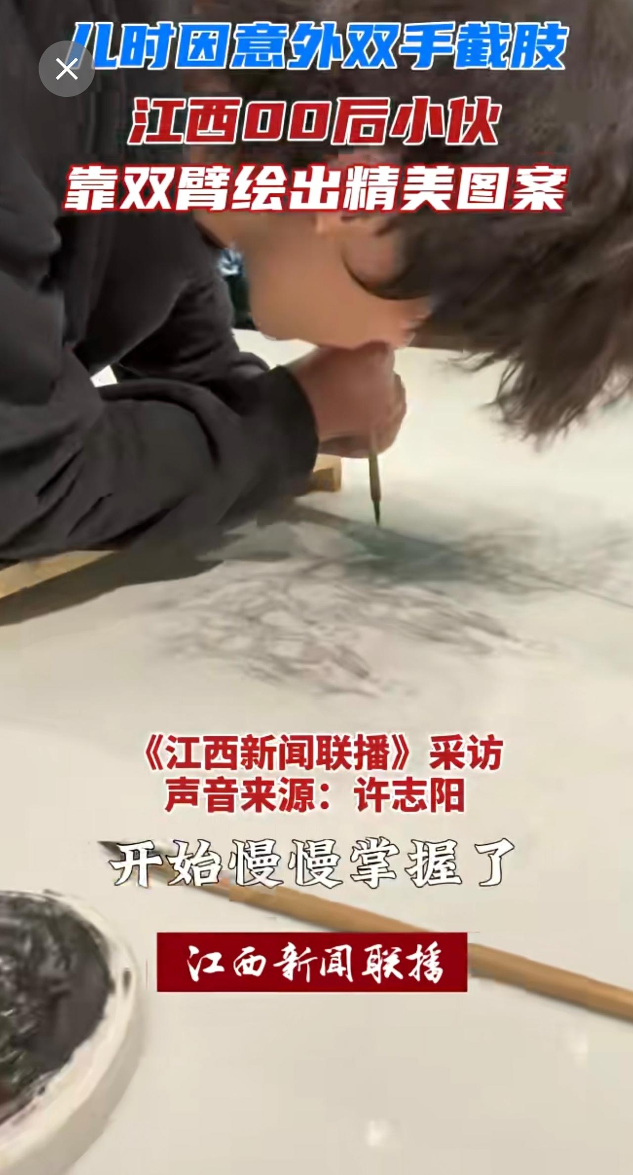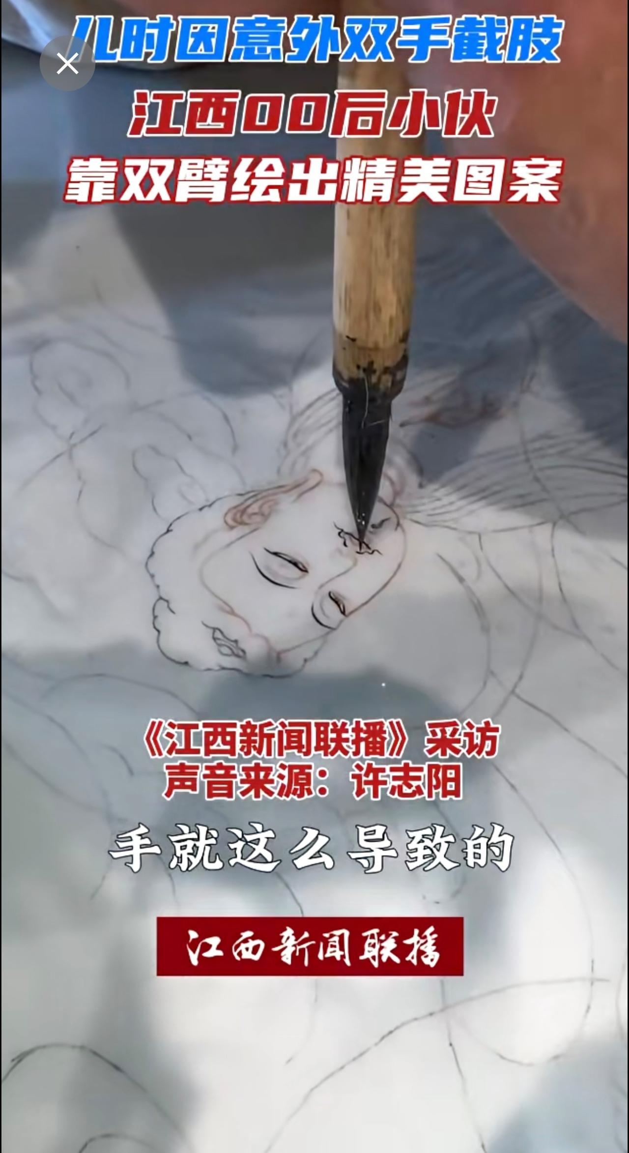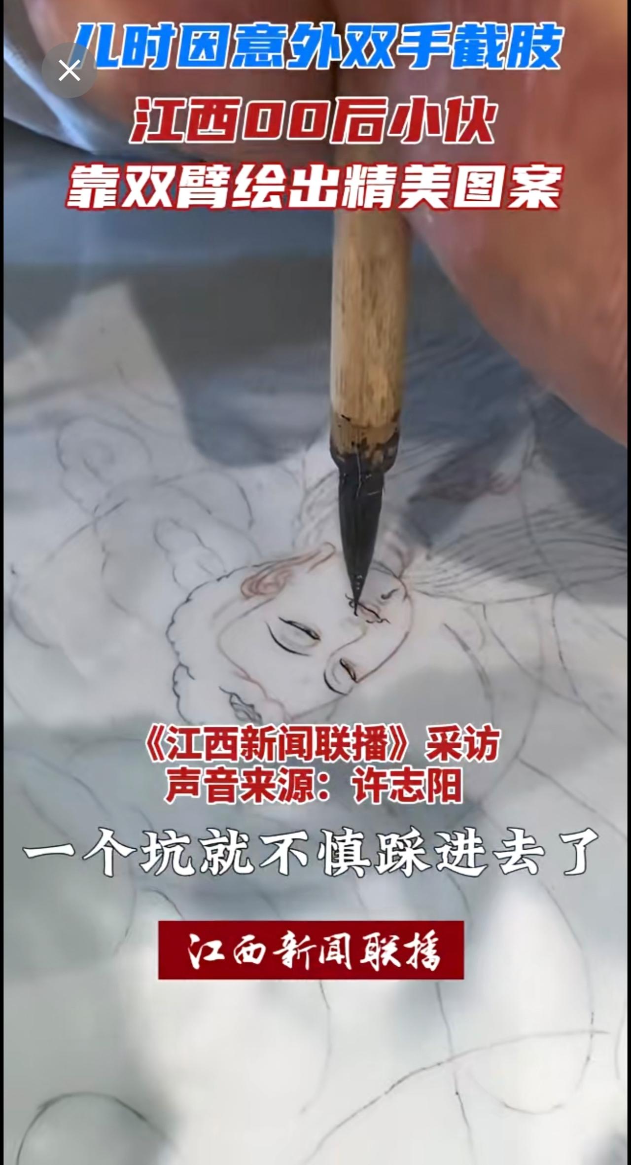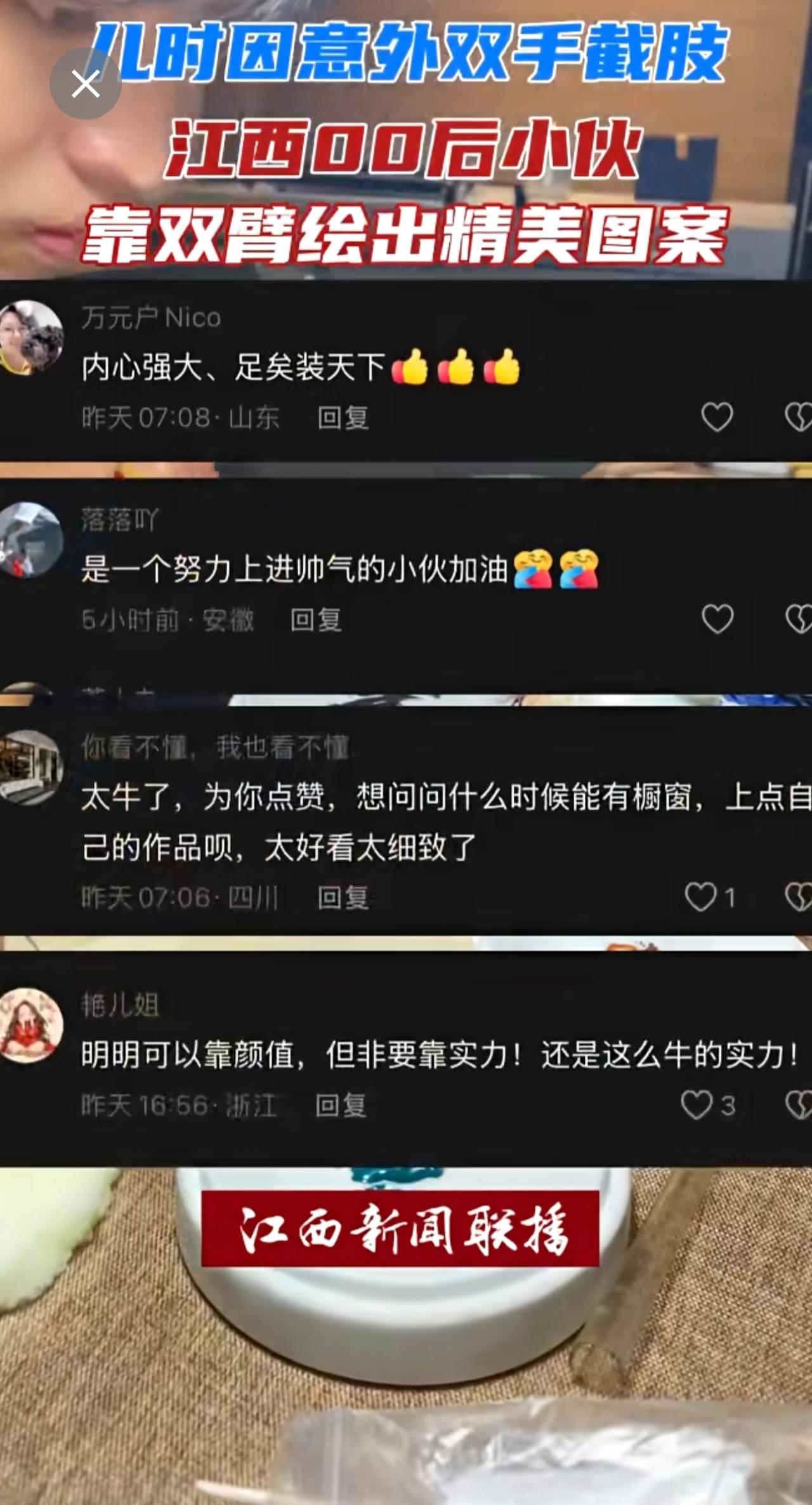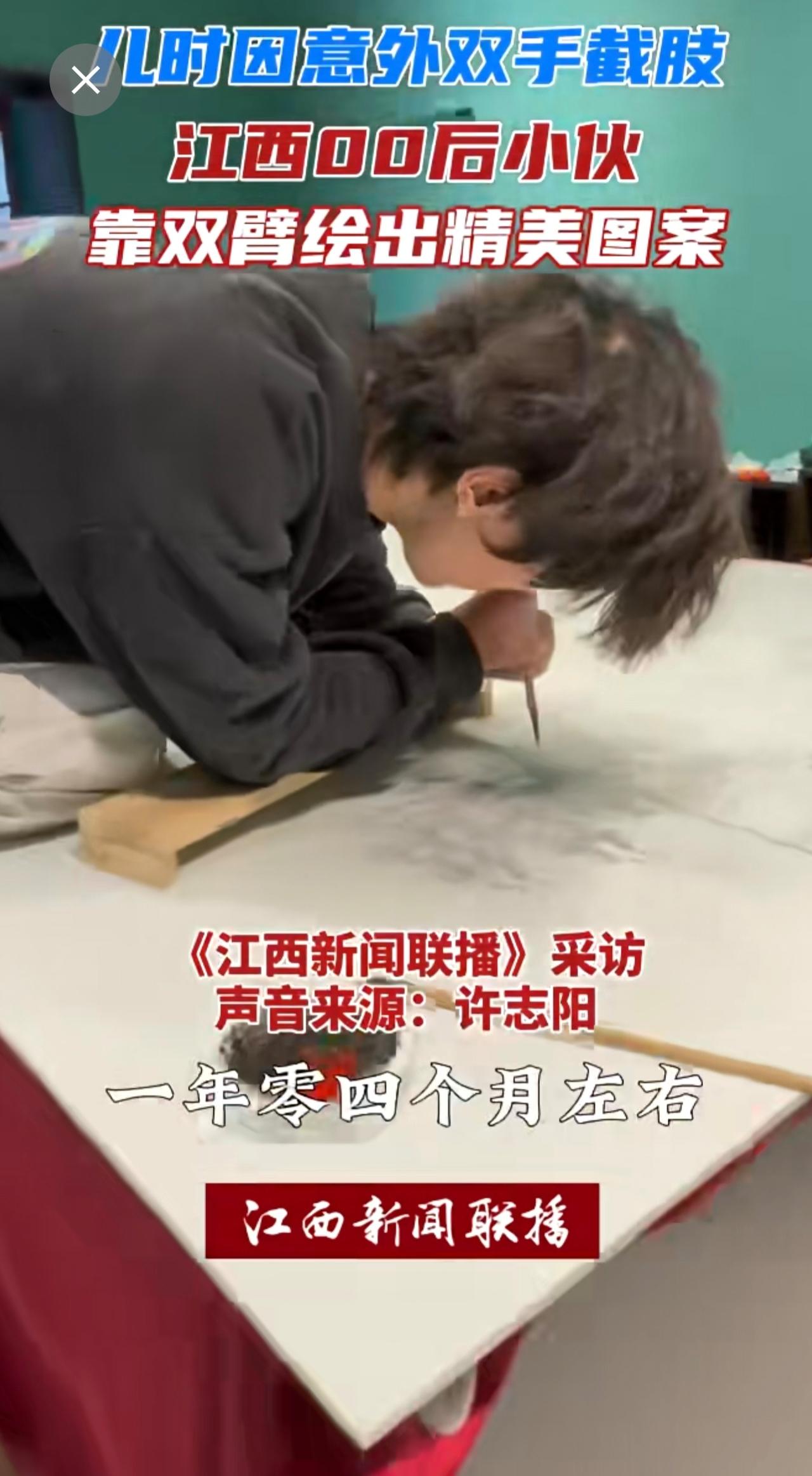 儿时因意外双手截肢,江西00后小伙靠双臂绘出精美图案。