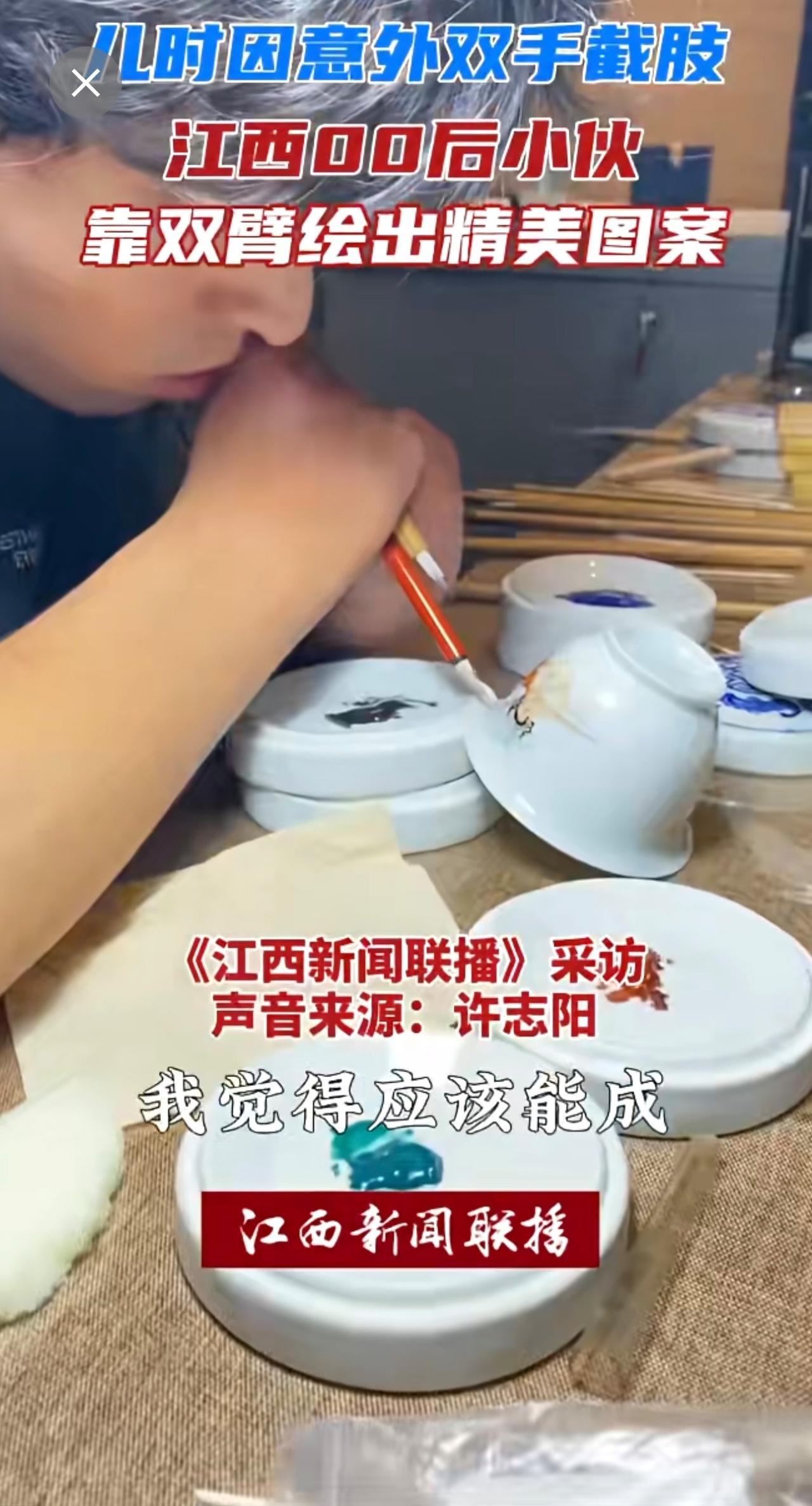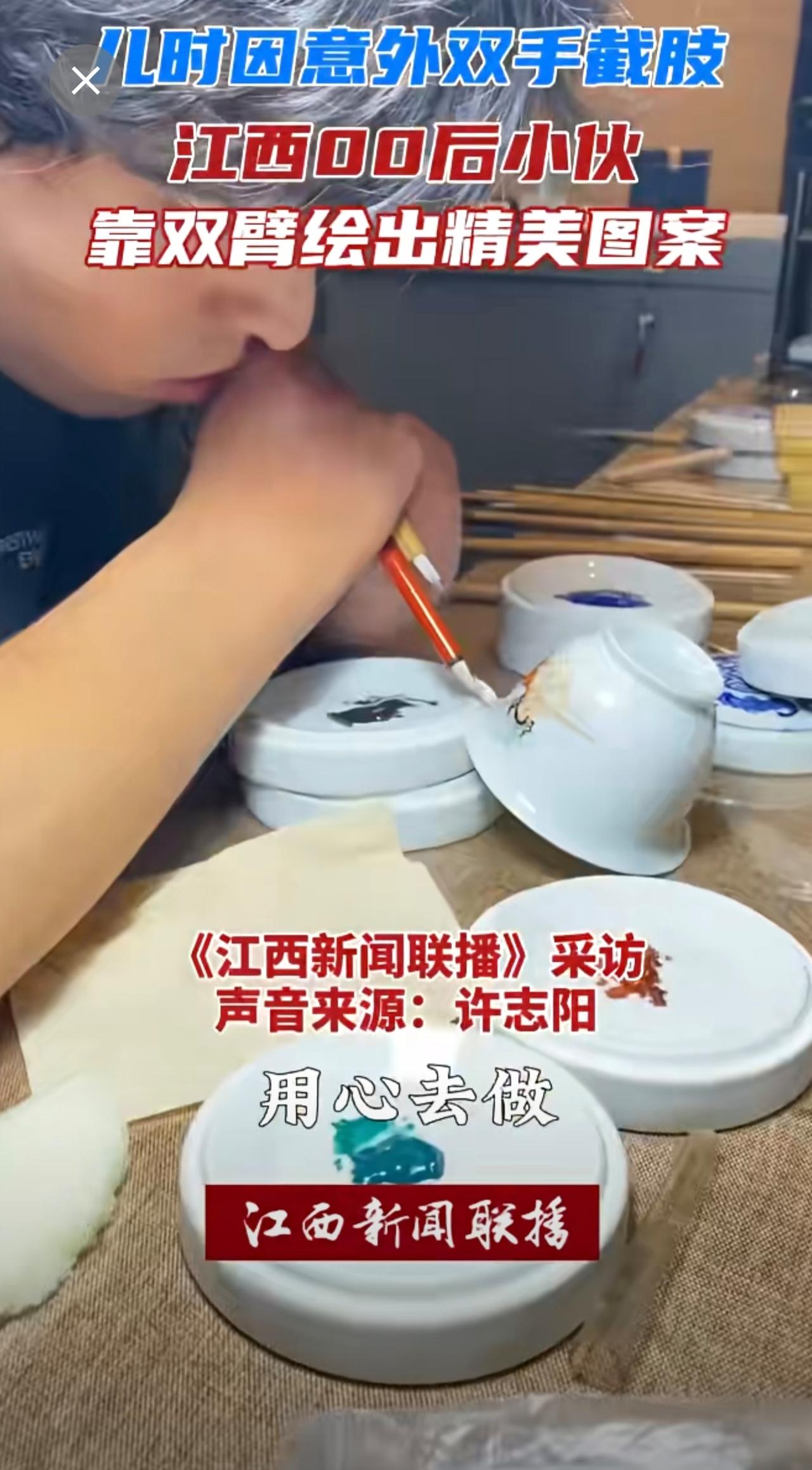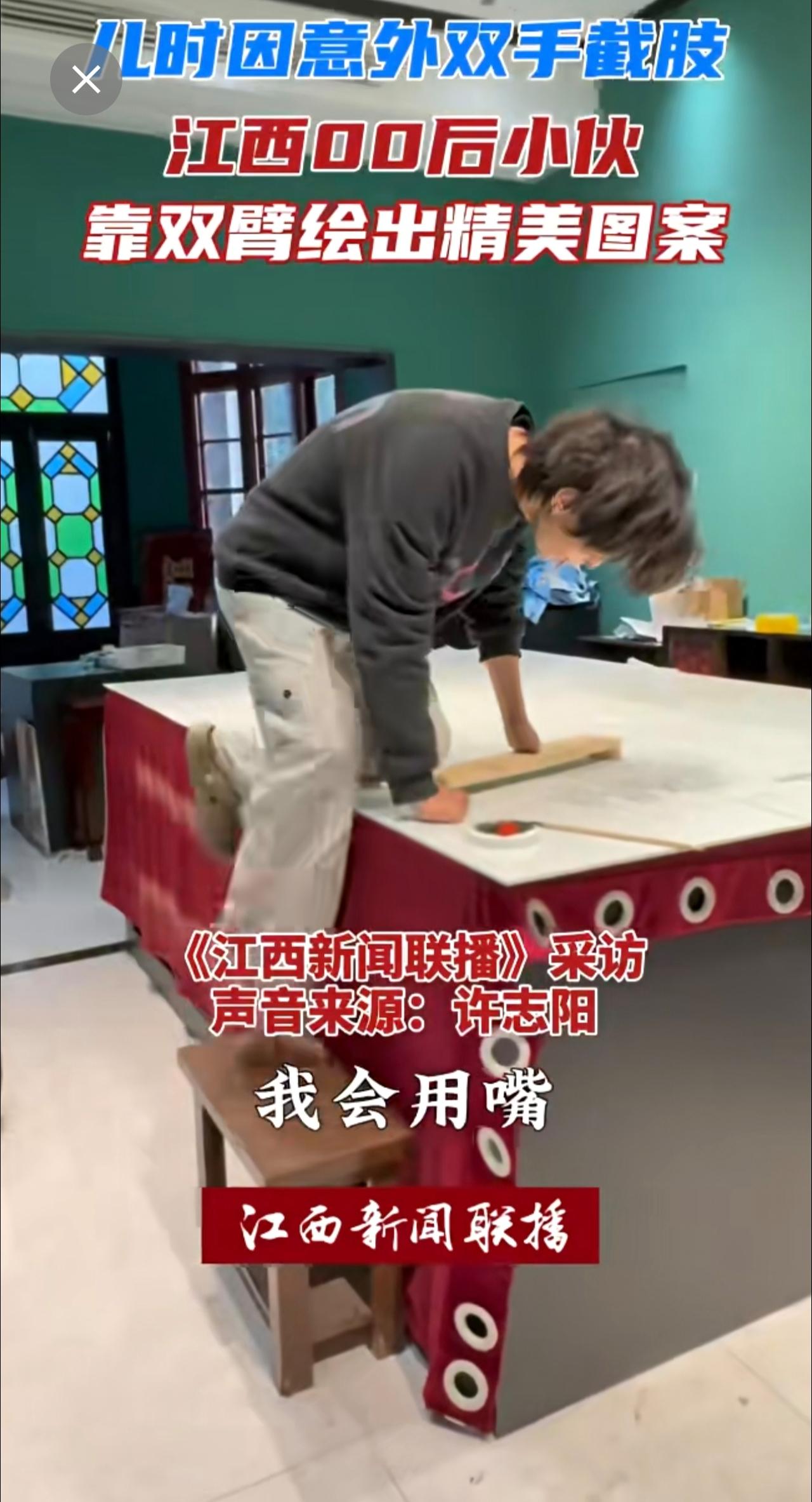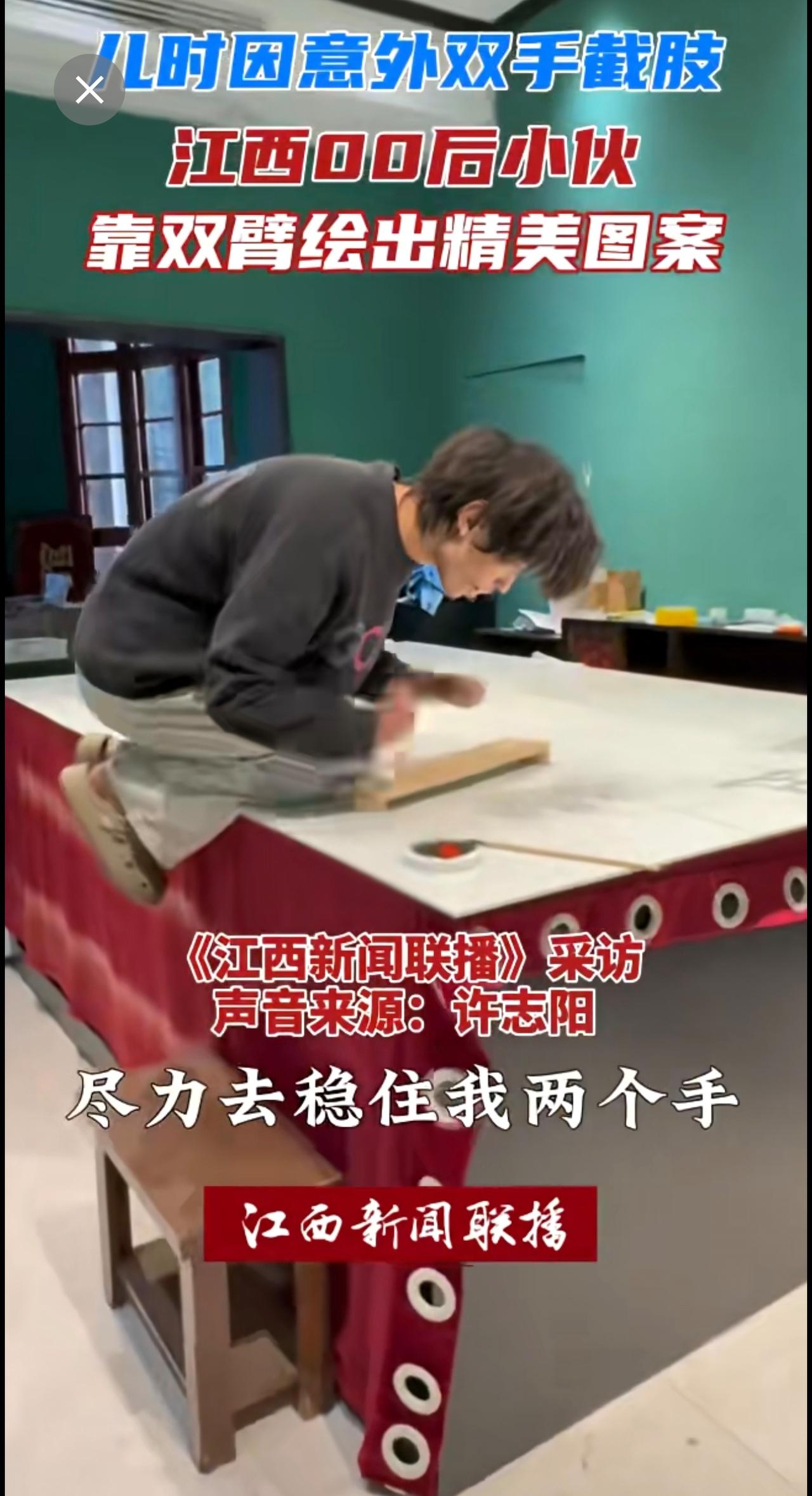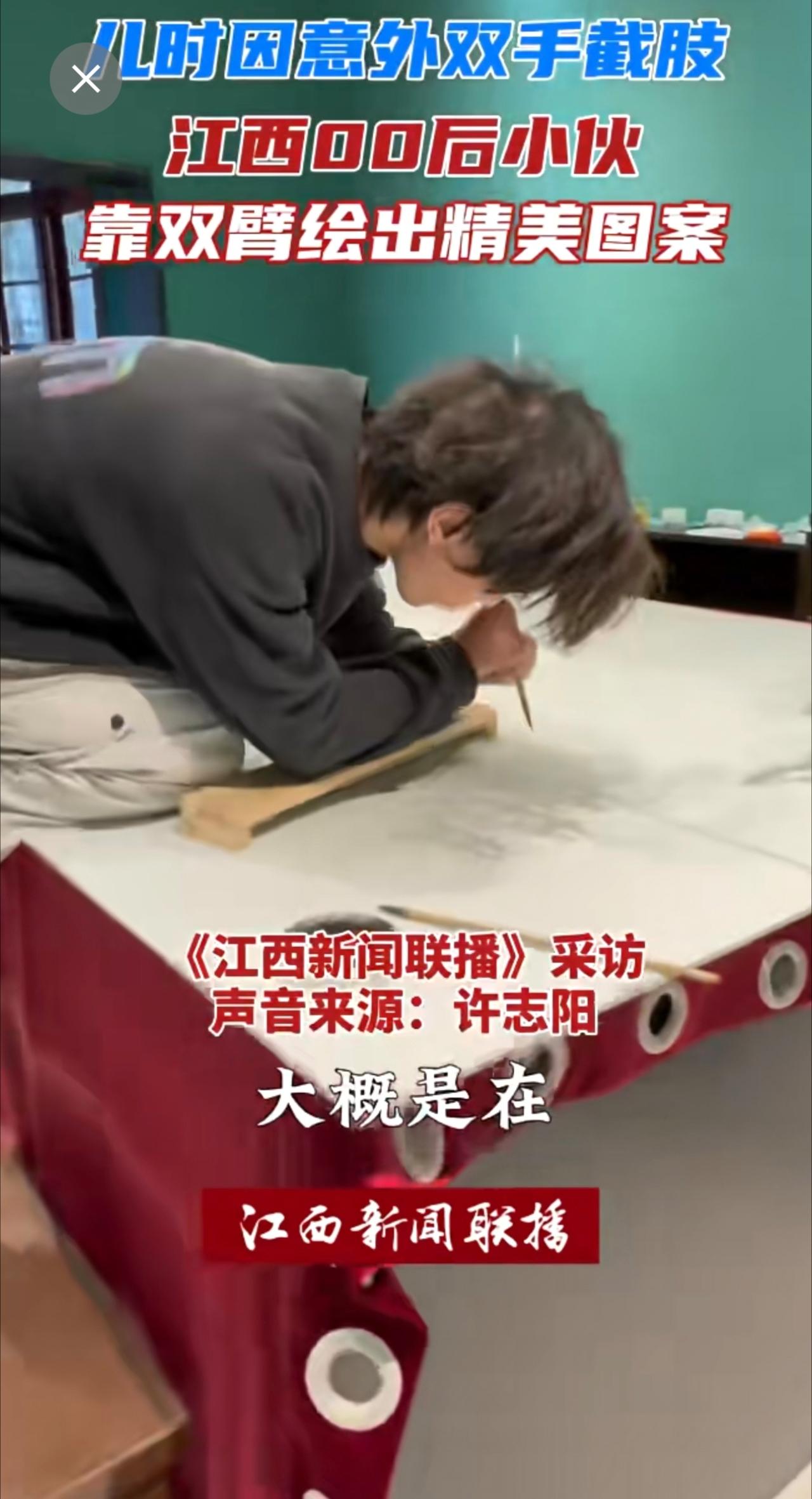 儿时因意外双手截肢,江西00后小伙靠双臂绘出精美图案。