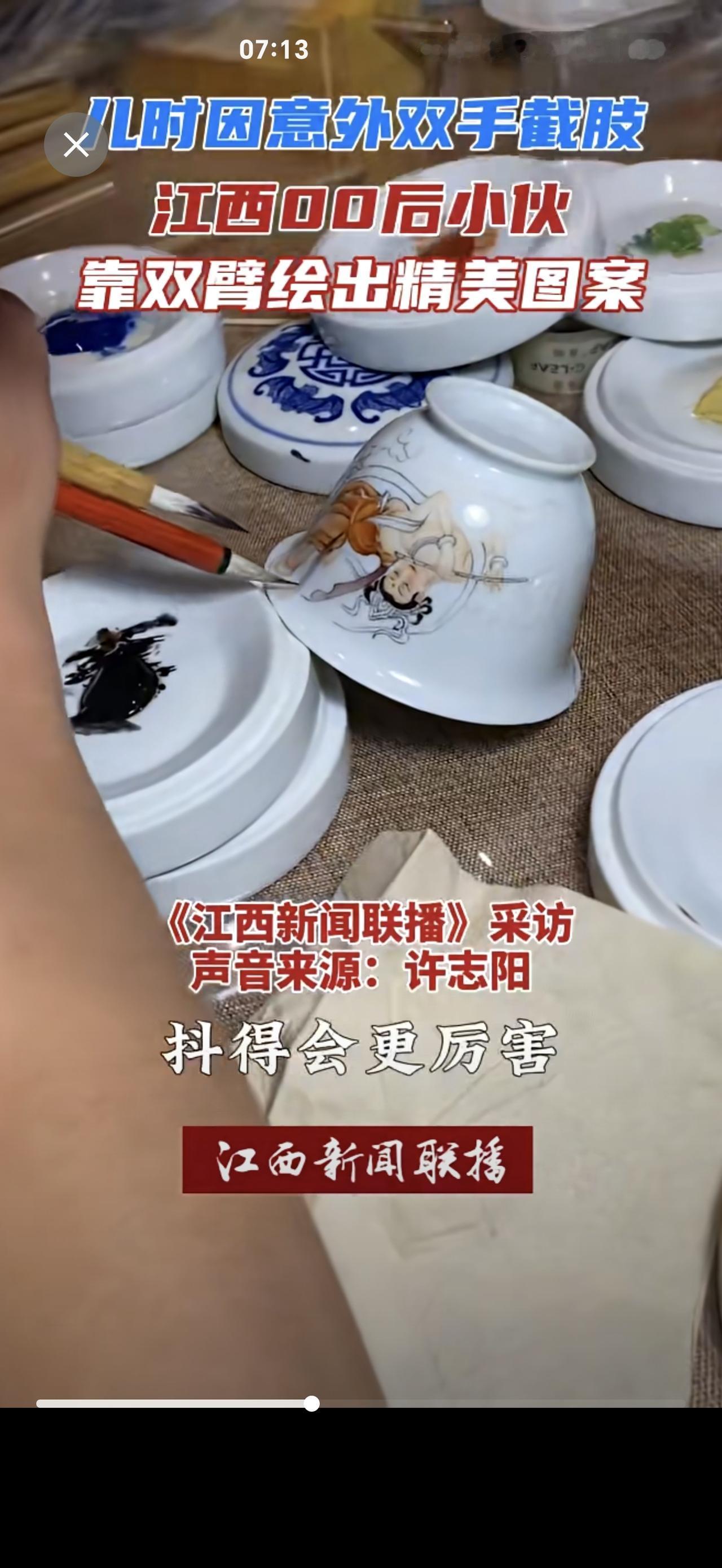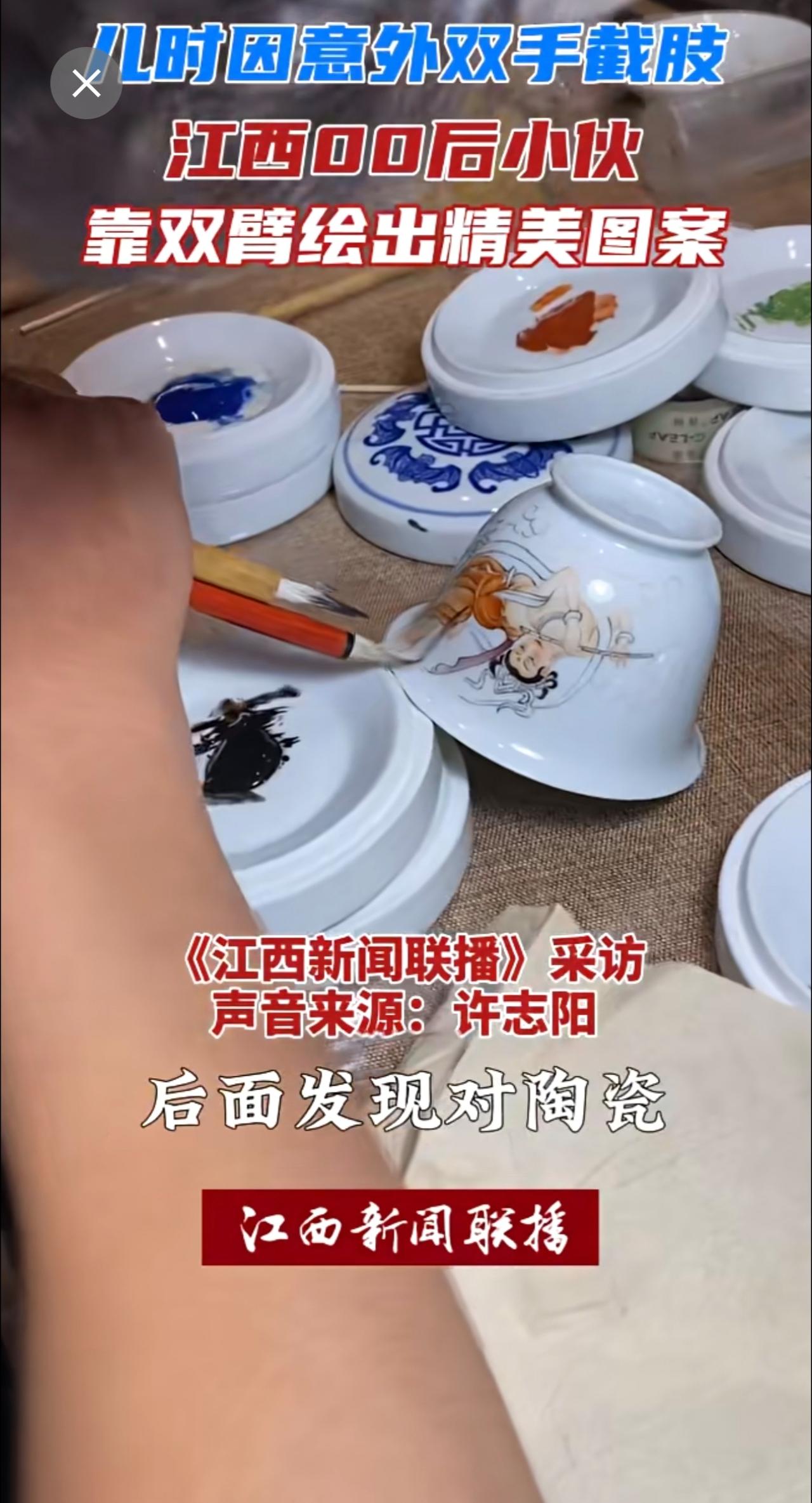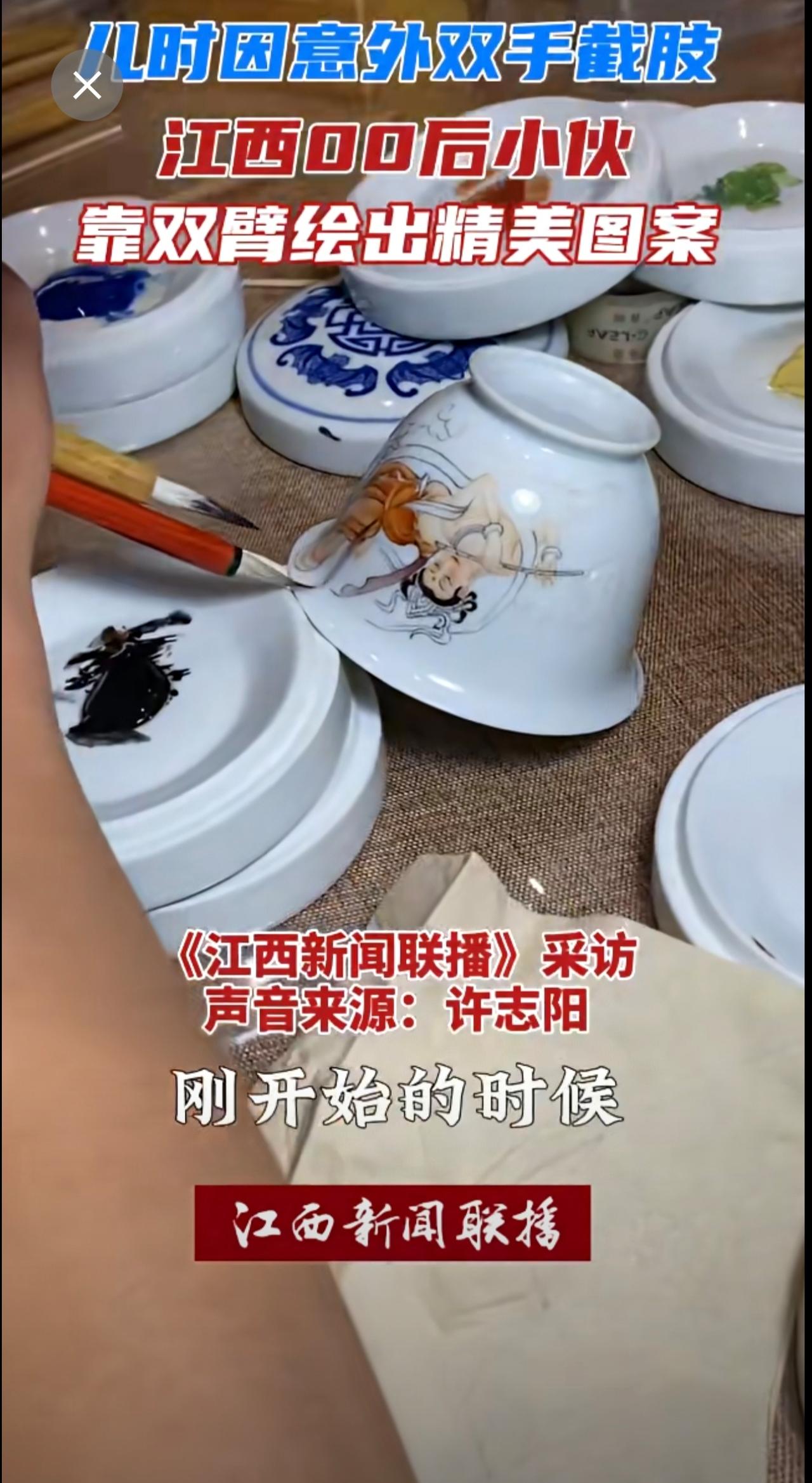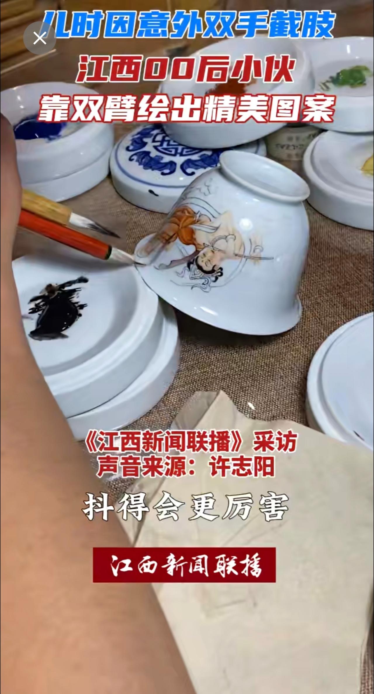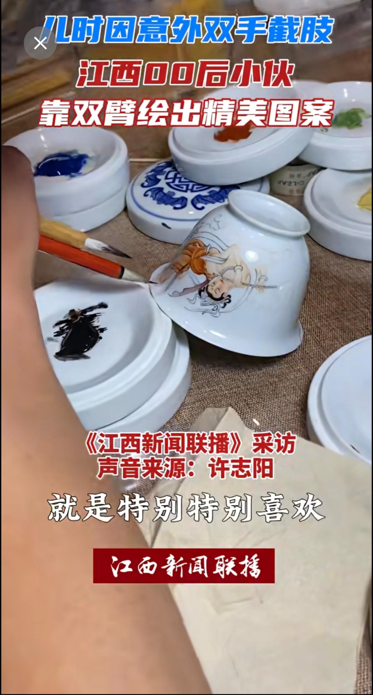 儿时因意外双手截肢,江西00后小伙靠双臂绘出精美图案。