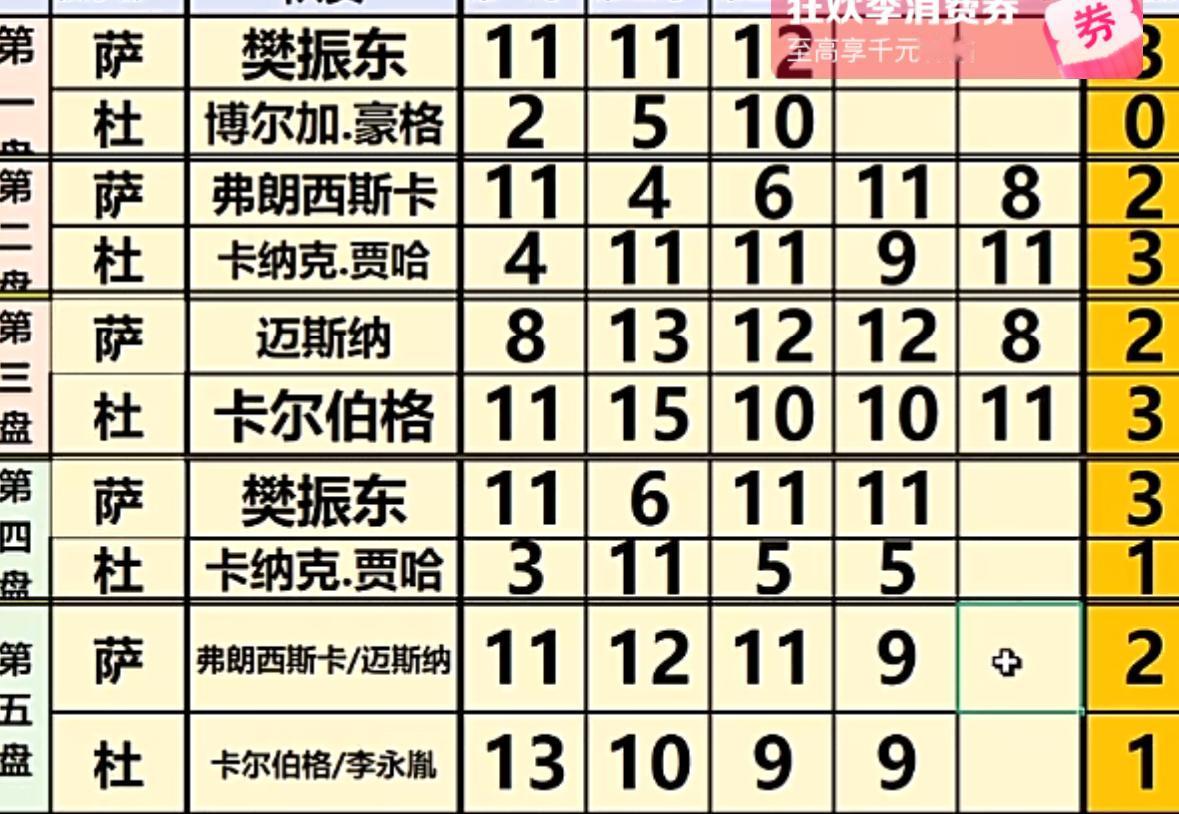 萨尔布吕肯3:2杜塞尔多夫 获胜时刻 弗朗西斯卡抱起队友 12月21日晚九点开始, 萨尔与杜塞苦战5盘,打了4个半小时,一直打到22号凌晨一点半, 第五盘,弗朗西斯卡与双打搭档 获胜时刻,弗朗西斯卡抱起队友! 樊振东一单二分, 这场比赛非常艰苦😥, 下一次弗队长与樊振东打双打, 会不会抱起樊振东, 有人说,弗朗西斯卡抱不动樊振东, 有点困难, 弗朗西斯卡,人高马大, 欧洲大汉,抱樊振东不会这么轻松, 但没有任何问题, 因为王皓都能把樊振东抱起…… 这场比赛贾哈打得不错👍, 赢了弗朗西斯卡, 和樊振东打的第四盘,第三局, 比分咬得很紧, 还有几个超级快速拉锯球, 非常精彩! 贾哈不好打, 国乒遇到他,也应该提前 做好准备!