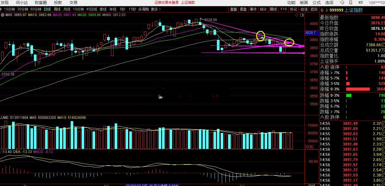 今日看盘上证指数 靴子落地,继续向上 经历了3815的破底翻5-8小时的反弹后,上证成功的突破下降通道,收在3886之上,形成鲤鱼跳龙门的结构,这里会有个小回踩确认突破有效性。确认完后会继续向上。 周末眼花缭乱的信息太多,叠加特朗普科技传媒400亿并购核聚变初创公司,我认为AI下半场是电力能源资源之类的主场是没有疑虑的,自己去搜一下应该很容易找到(关键词:高盛三大周期性板块),大意观点就是高位的科技如硬件,如易中天工业富联之类的空间可能非常有限,更大的机会大概率在消费能源资源等周期性板块. 12月经济工作会议以后,明年促消费、扩大内需是排首位的工作,而且相关部门上周又发文件,将在50个城市开展消费“新三态”的试点,后面地方促消费的政策也可能会相继出台,所以政策是持续出台落地。消费板块一些低位的,还会有补涨的机会。 商业航天/卫星发射等,上周老美宣布重返月球的计划,而且SpaceX的财务官确认明年SpaceX将IPO。商业航天多关注走上行趋势的品种。不破5/10日线,安心持有。 指数:又到压力位,我倾向于没有大的利好可能很难过去,依旧是震荡的框架,3900上下百点都是震荡,这里密集成交,上去有年底兑现的资金,下去有郭嘉队等着。