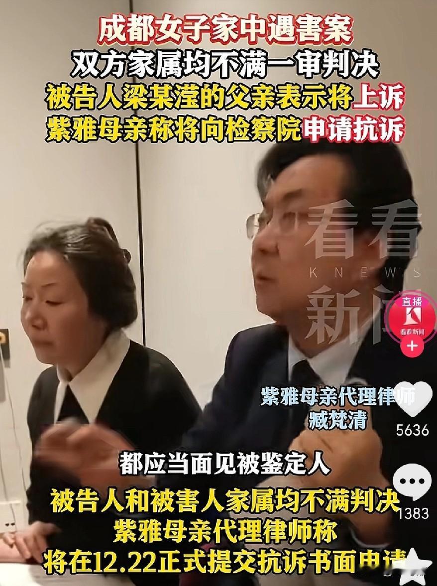 成都女子“家中遇害”一案,双方都不满意一审的判决,被告人梁某滢的父亲要求上诉,说这是舆论压迫下的妥协,认为自家孩子有“精神病的鉴定”,不应该判无期。 受害者紫雅的母亲也不满意这个结果,由她的代理律师臧梵清,于12月22日正式提交抗诉书面申请。这场余波,因一份充满争议的精神病鉴定,更添了几分复杂与沉重。 这份鉴定患者有没有病的“鉴定人”共有四人,有些连本人梁某滢都没有面见过,就凭“当庭记录”的笔录文字就出了鉴定完毕,实在不能让人信服。 更令人费解的是,梁某滢在庭审中逻辑清晰,数十次坚称自己没有精神疾病,甚至拒绝辩护人以精神病为由进行辩护,只承认自己是正当防卫,最后还说要自首,但没被法院采纳。 最后臧梵清律师明确表示,抗诉将围绕三大焦点展开,一是死磕这是一起入户伤人,二是质疑精神病鉴定结论的合法性与科学性,三是强调梁某滢毫无悔罪态度的主观恶性。 其实按照我国法律规定,部分刑事责任能力只是“可以”从轻处罚,而非“必须”从轻,法院还要结合犯罪情节、手段和危害程度综合判断。这个案子如果要进入二审了,大家最关心的就是那份精神病鉴定到底作不作数,也盼着二审能查得明明白白,给两边一个对得起法律、对得起人心的交代。 (图片来自网络视频)