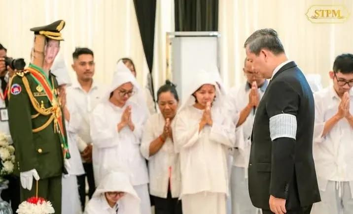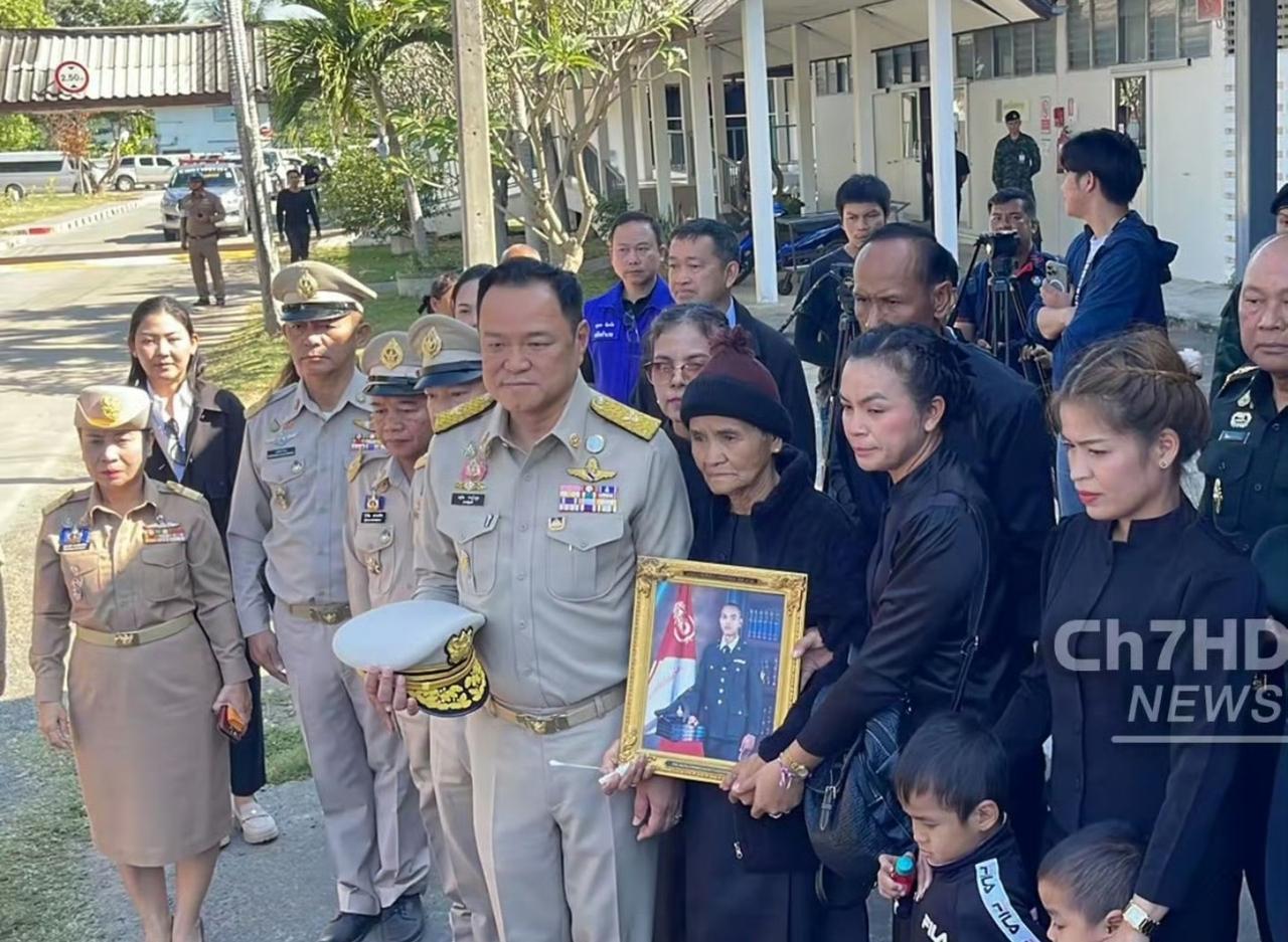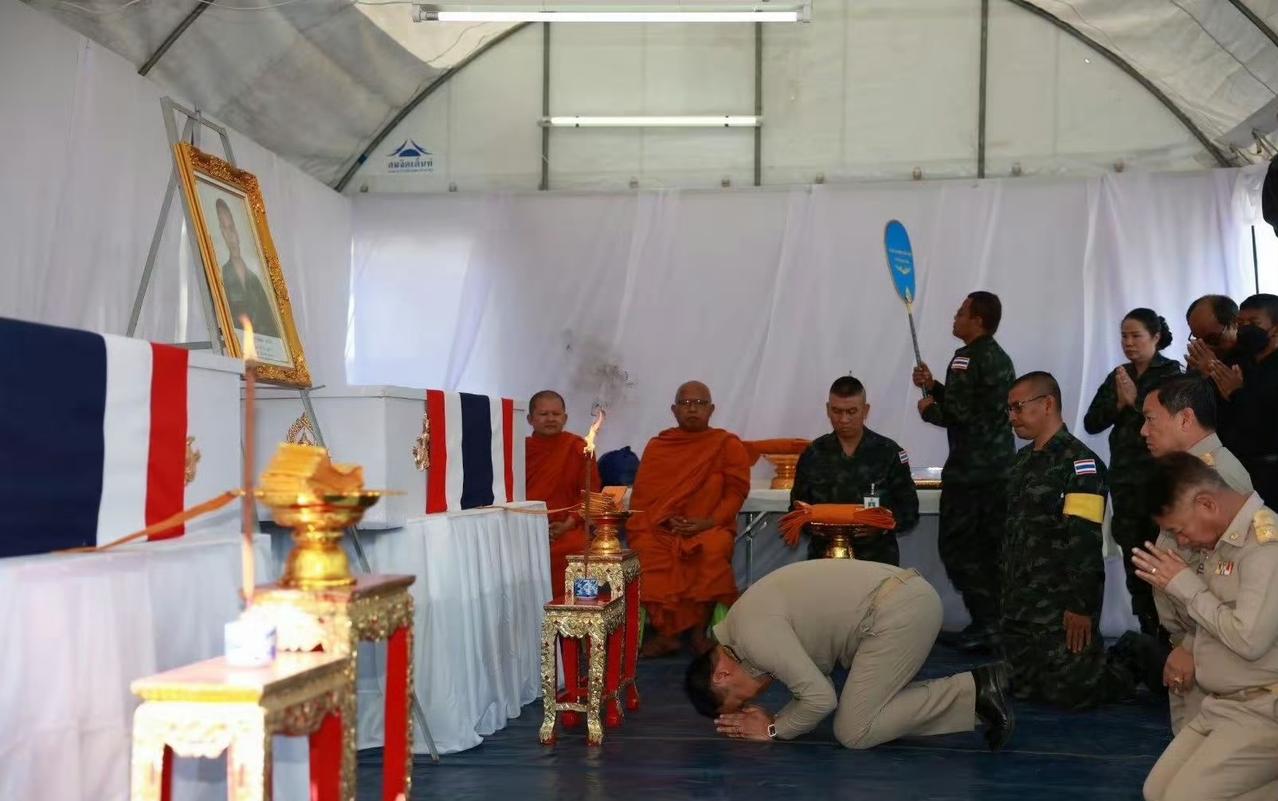 泰国总理阿努廷出席阵亡泰军士兵的葬礼,阿努廷总理亲自下跪送别在柬泰冲突中牺牲的泰国士兵,可谓虔诚,其他随行官员也一起跪下,送牺牲士兵一程。 上一轮柬泰冲突后,柬埔寨首相洪玛奈也亲自参加了阵亡将军的葬礼,也是戴上了孝,可见柬泰双方都很重视为国捐躯的将士。