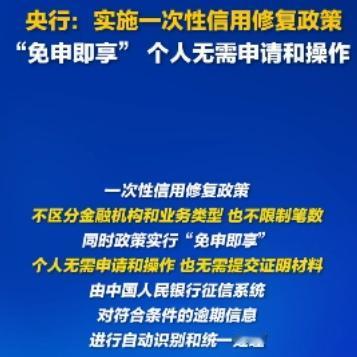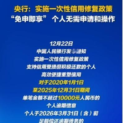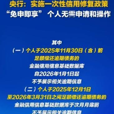 央行突然放福利!征信污点能自动消?关键细节全在这 刚刷到央行最新政策,直接惊到我了——居然出了一次性信用修复的好事,对咱们普通老百姓太友好了! 划重点:2020到2025年的小额逾期,单笔不超1万,只要明年3月底前还清,征信上的逾期记录直接“消失”。不管是信用卡、房贷还是消费贷,都能享受,而且不用自己跑断腿申请,系统自动处理,简直是懒人福音。 我特意查了下时间节点:今年11月底前还清的,明年元旦就生效;12月还清的,次月月底也能更新。还有个重要提醒,千万别信啥“付费修复征信”的,全是骗子,官方明确免费,明年上半年还能免费查两次征信确认结果。 说实话,这种政策真的很贴心,毕竟谁还没个忘还款的时候,小额逾期影响贷款买房买车太亏了。不过也有人觉得会不会纵容逾期行为,你们怎么看?