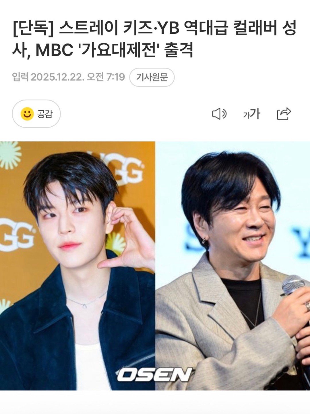 Stray Kids金昇玟 x YB将在MBC歌谣大祭典上带来历代级合作舞台 据22日OSEN的采访,Stray Kids和YB实现了历代级合作。Stray Kids主唱昇玟和YB将在31日举行的MBC歌谣大祭典上带来特别的合作舞台,让观众和粉丝们狂热。 电视台相关人员透露,他们的历代级合作舞台是应YB的邀请而达成的。平时YB一直关注着Stray Kids的活跃,在1月6日举行的第38届金唱片颁奖典礼上,YB演唱《烟草店小姐》和《我是蝴蝶》时,接近了观众席上的后辈歌手们,对表现出热烈反响的Stray Kids留下了深刻的印象。因此,在构想歌谣大祭典合作舞台时,自然而然地提到了Stray Kids。