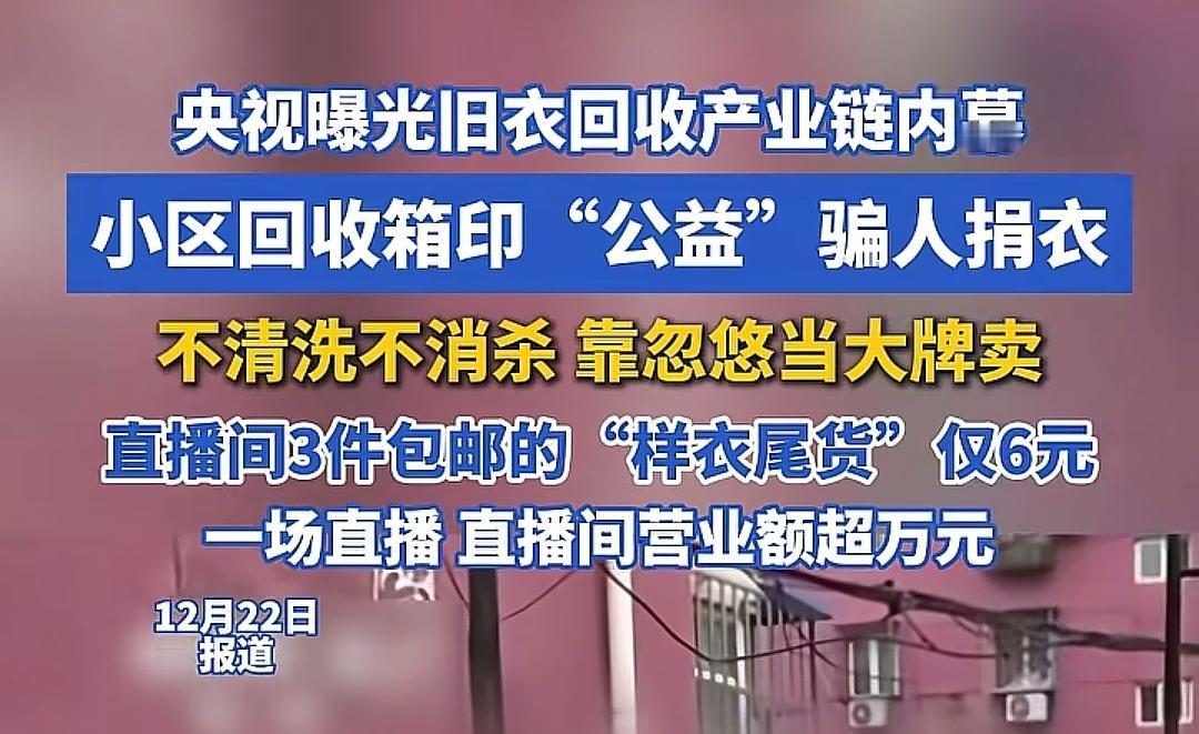 打着公益捐赠的名义赤裸裸的敛财! 我们洗干净捐的衣服,运到仓库,被直播团队像赶集一样挑拣,再以极低价格,3件6元还包邮,卖给消费者。变成了他们低成本高利润的倒卖商品。更让人后怕的是,这些旧衣来源复杂,除了回收箱,甚至还有垃圾站,未经任何清洁消杀流程就直接上架。被商家用微脏、微瑕的话术轻描淡写地掩盖。 直播电商让低价尾货的噱头极具吸引力,消费者冲着捡漏下单,却不知道买的是别人穿过的旧衣。商家为了控制成本,省去清洗消杀的环节,靠着供不应求的销售态势赚得盆满钵满。 我想说公益不是生意的遮羞布,消费市场也容不得以旧充新的欺诈!作为消费者,我们也要提高警惕,对过低价格的大牌尾货保持理性。 二手衣服捐赠 社会公益捐赠 募捐乱象