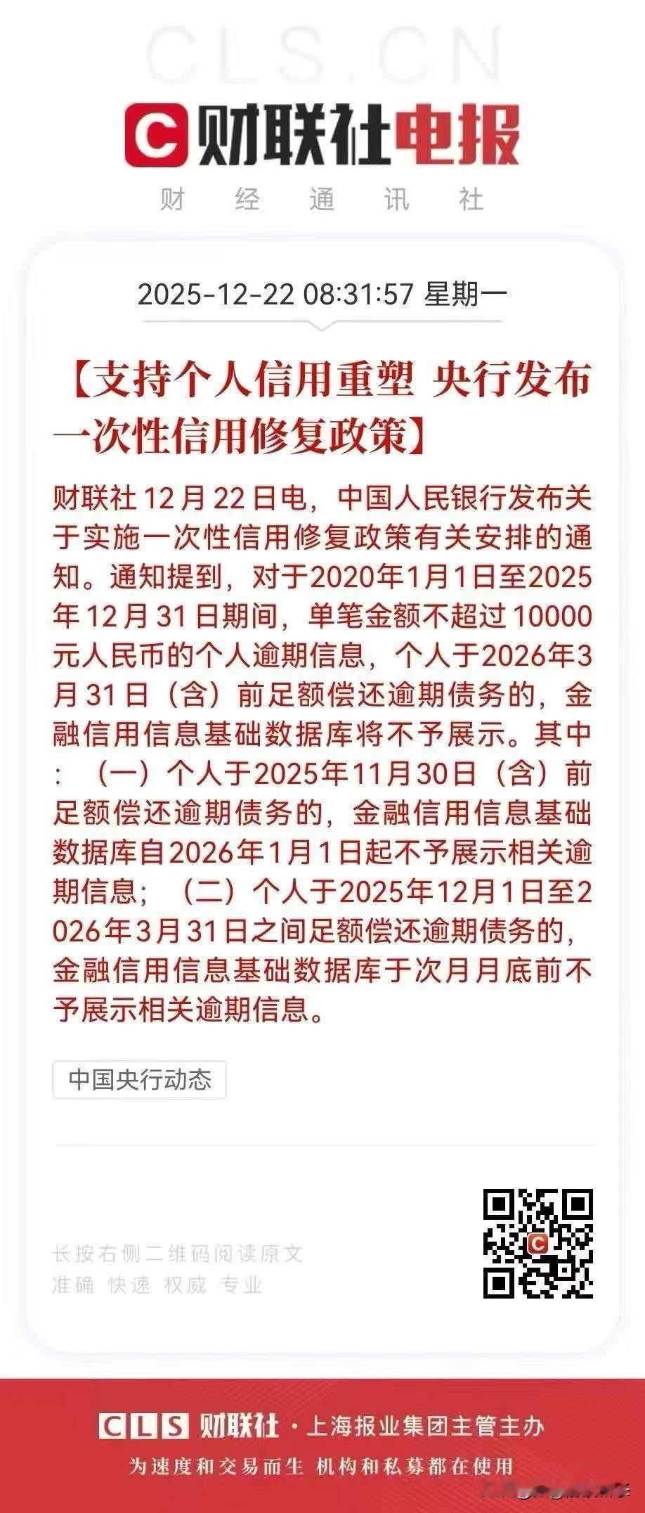 一次性修复信用!“重新做人”机会来了! 来来来,是不是因为欠钱不还的人太多,很多人现在都不在乎什么黑名单,什么限制高消费? 太多了,这样下去,信用制度也没用了,要知道,制度都是给老百姓定的。 所以。从明年开始,之前5年只要是欠款10000元之内的,在6月30日之前还掉,征信就没问题了。 自动修复。 不过,我欠的是一万块吗?