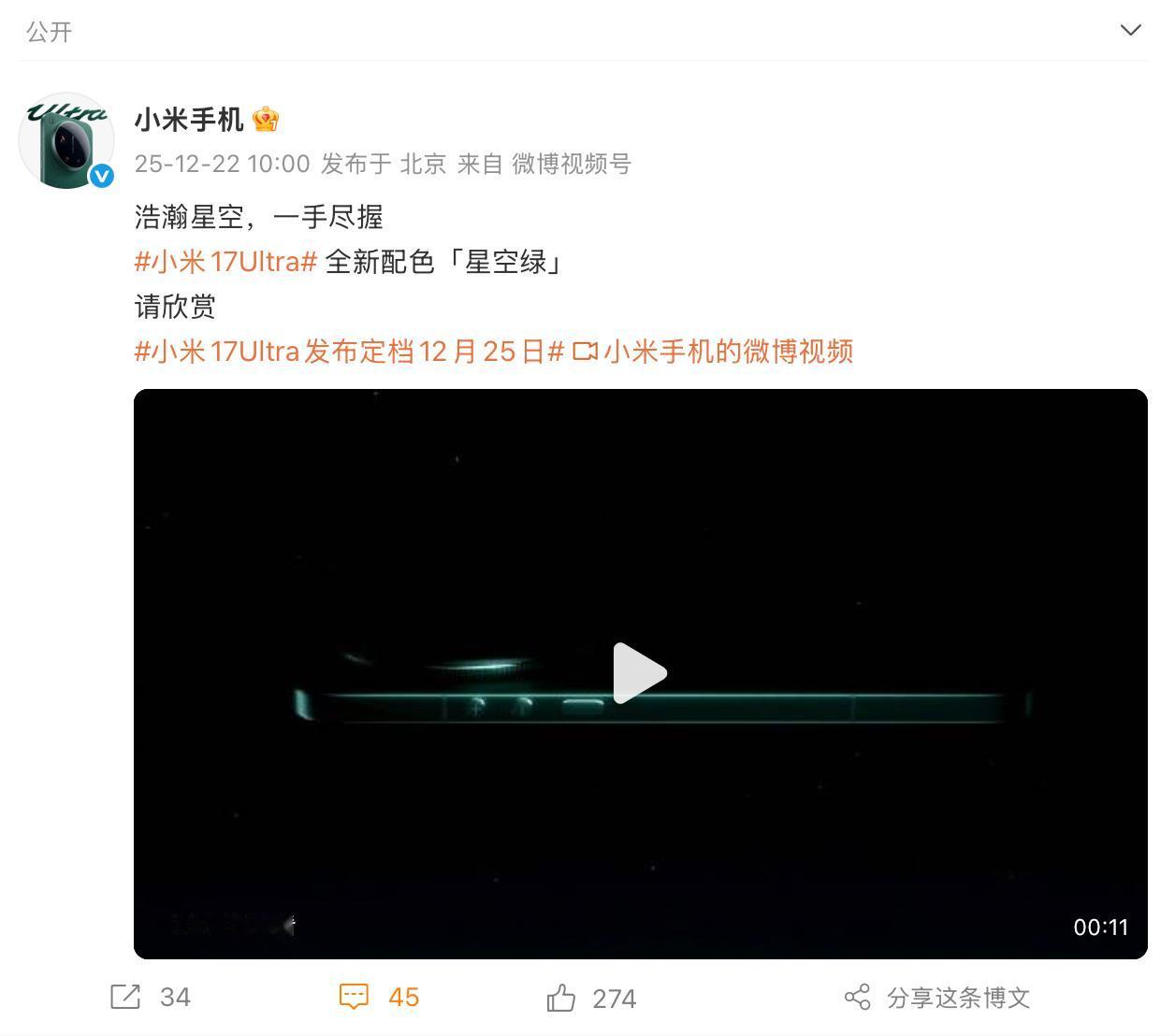 小米17Ultra全新配色来了,星空绿!自从造车后,不得不说小米旗舰手机的配色