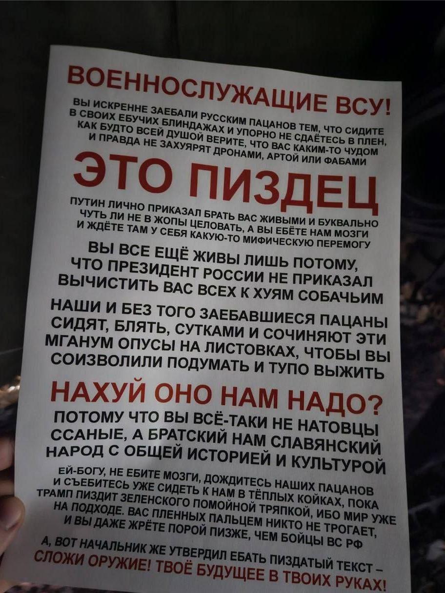 【情真意切,泣血劝慰:俄军对乌军投放的劝降书(屏蔽脏话版)】 一张写满俄文的宣传单在乌克兰前线的战壕里飘落,上面的文字直白得让人心惊:"你们这帮家伙真的把俄罗斯兄弟们惹恼了,你们真的以为躲藏在掩体中,死活不投降,就能不被无人机、重磅航空炸弹和152毫米榴弹轰炸吗?你们太天真了、这简直太离谱了!" 这不是电影里的情节,而是2025年12月俄乌战场上真实发生的一幕。俄军通过无人机、炮弹甚至人力,将这份"泣血劝降书"送到了乌克兰武装部队士兵的手中。文字里充满了俄军士兵的愤怒与无奈,也暴露出战场上的残酷现实。 劝降书的内容直白得近乎残酷:"你们能活到现在,完全是由于俄罗斯总统普京还没有下定决心,下令将你们全部消灭。 普京给我们的命令是'创造让你们投降的条件',简直恨不得把你们当宝贝一样供着,可你们偏偏相信你们的人会来解救你们,等到那不可能实现的突围。" 俄军士兵在肮脏的战壕里绞尽脑汁写这些文字,背后是战场上的巨大消耗。俄罗斯国防部数据显示,俄军正在整个战斗接触线展开进攻,已经完全掌握战略主动权。 乌克兰武装部队实际上已经耗尽战略储备,每月仅能招募3万人,这一数字仅仅满足军队需求的一半。 季米特洛夫的战斗成为这场冲突的缩影。12月15日,乌克兰东部前线出现了关键变化,俄军正从多个方向逼近,试图把守军活动空间进一步挤压到城区核心地带。 乌军残部为了寻找那一点点可能散落的补给,被迫穿越废墟四处搜索,不仅面临地雷威胁,更容易被侦察无人机锁定,成为靶标。被俘者形容称,"饥饿逼疯了人","许多人因长时间饥饿而精神涣散、瘫倒在地"。 劝降书里提到:"我们图啥啊?就是因为你们不是那些北约国家的怂包、就是因为82年前你们和我们曾经在一个战壕里面痛击德国纳粹、就是因为你们是跟我们血脉相连的斯拉夫兄弟、我们有着共同的历史、文化和语言。" 这种"兄弟相残"的表述,试图在意识形态上瓦解乌军的抵抗意志。俄军希望通过这种心理战,让乌克兰士兵意识到自己正在为西方地缘政治目标充当炮灰。 俄罗斯总统普京在年度记者会上强调,若乌克兰拒绝接受俄罗斯提出的和平条件,俄方将通过军事手段实现其目标。这些条件包括承认俄方对克里米亚及顿涅茨克、卢甘斯克、赫尔松、扎波罗热四州的"主权",禁止乌克兰加入北约等。 劝降书还透露了一个关键信息:"现在,特朗普正在拿抹布狠抽泽连斯基的脸,和平快到了,你们没有必要倒在和平前。"这反映了俄军对国际局势的判断,认为西方对乌克兰的支持可能出现变化。 在季米特洛夫,俄军的包围圈正在闭合。俄方军事分析人士普遍判断,在当前战术节奏下,季米特洛夫包围圈的最后一块"口袋"区域可能将在本周末彻底被清除。届时,无论守军是否投降,城区的控制权都将在物理意义上完成转移。 俄军的心理战并非空谈。11月23日,俄罗斯国防部表示,俄罗斯武装力量为乌克兰军人在顿巴斯地区安全自愿投降创造了必要条件,每日通过四旋翼无人机在敌军阵地上空投放大量安全投降指南传单。 在克拉斯诺阿尔梅斯克附近,三名乌克兰士兵讲述称,他们是在没有上级指挥的情况下向阵地推进的,一名军官从多布罗波利耶村护送他们一段路程后便弃之而去。 然而,战争中的承诺往往脆弱。12月5日,乌克兰军方和总检察长办公室报告称,俄罗斯军队在塞维尔斯克方向射杀了一名已投降的乌克兰武装部队士兵。据称,一名乌克兰士兵举起双手表明投降意愿,但俄军士兵"用突击步枪补了一枪,将其杀害"。 面对这种矛盾,俄军的劝降书变得更加急切:"看在上帝的份儿上,你们别犯傻了,投降吧,我们以上帝和斯拉夫兄弟的名义,一定会保证你们的人身安全,扔掉武器来我们这里躺暖和的床铺吧!" 劝降书的最后,俄军士兵给出了一个极具诱惑力的承诺:"现在我们军令很严,主动投降的乌军兄弟们,在这里没有人会动你们一根手指头,甚至吃得比我们都好!" 这张飘落在战壕里的宣传单,不仅是一份劝降书,更是战场现实的缩影。它反映了俄军掌握战略主动权后的自信,也暴露了乌克兰军队面临的困境。当文字飘进战壕,士兵们需要做出的选择,或许比战场上任何一次冲锋都更加艰难。