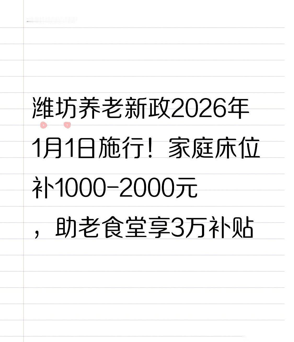 刚刷到个新闻,差点以为是段子。 潍坊那边,要在家里设个养老床位,政府直接给服务机构补1000块。 你敢信吗?这不是补贴养老院,这简直是给我们这代夹心层续命啊。 说真的,每次回家看到爸妈白了的头发,心里就咯噔一下。 最怕什么?最怕他们突然生病。 不是不想管,是真怕管不起,更怕自己一个人扛不住。 工作、孩子、老人,三座大山压得人喘不过气,真到了一人生病、全家“瘫痪”的时候,你就知道什么叫绝望。 现在这政策,感觉就像天裂开一道光。 你想想那个画面: 把家里改造一下,弄得跟个“准病房”似的,老人住着舒服,我们心里踏实。政府给补贴。 失能老人,请人上门照顾,每月给报销最高500;送去机构,每月报销最高800。这都是真金白银啊。 还有那个助老食堂,一下给3万。以后老人下个楼就能吃上热乎饭,解决了多少双职工家庭的大难题。 最让我觉得靠谱的,是他们连“人”的问题都想到了。 给干这行的年轻人、护理员发钱,涨待遇。 说白了,钱给到位了,服务我们爸妈的人才可能更专业、更用心,这个行业才能转起来。 这已经不是一个简单的补贴了。 它是一种信号,一种让人心安的信号。 让你觉得,当你跑不动的时候,背后有人想着帮你搭把手,给你兜个底。 挺好。真的。