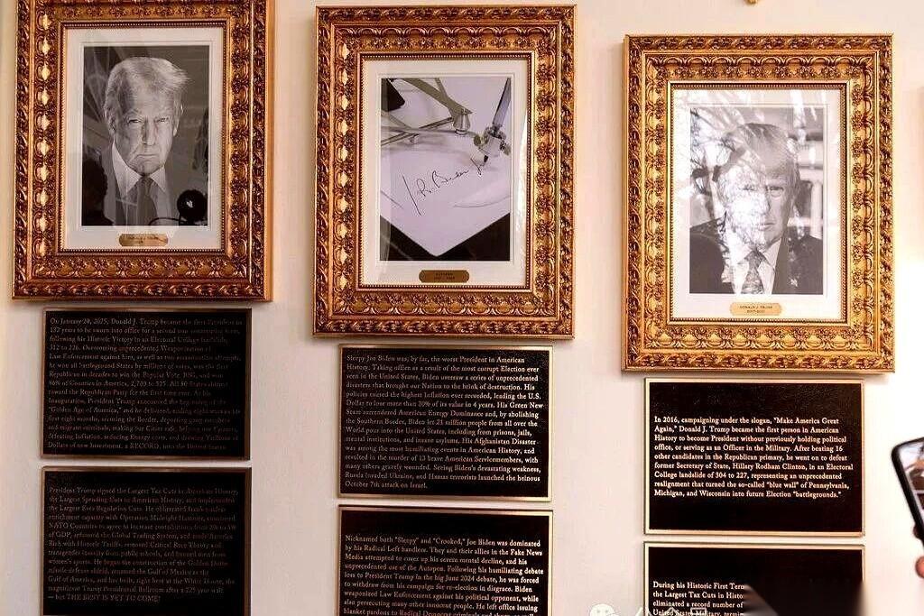 我天,我真的会笑死。 白宫的走廊里,历任总统的照片墙,到了拜登这儿,照片直接没了。 挂了张什么?一支自动签字笔的照片。底下铭牌写着:“瞌睡乔,史上最烂总统”。 这事儿一看就是特朗普干的。 太有画面感了。 感觉他不是卸任,是毕业离校前,把全班同学的纪念册都给涂鸦了一遍。 奥巴马的也没躲过去,评语是“史上最具争议的政治人物之一”。 真的,有时候你不得不佩服这种“小学生”级别的执着。 就是那种,“我不好过,你也别想舒坦”,“我走了,但我的精神攻击永存”。 我们总习惯把大人物想得很高深,谈什么格局、聊什么棋局。 但扒开那层西装革履,内核不就这点事儿吗? 不服气、爱面子、小心眼、睚眦必报。 哪有什么神仙打架,说白了,就是个不服输的小老头,下台了还要在别人桌上偷偷刻个“到此一游”,顺便骂两句。 这哪是政治啊。 这就是一出大型真人秀。 而且剧本烂到家了,但又真实到离谱。
