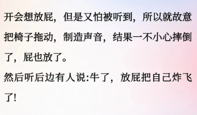 开会想放屁,但是又怕被听到,所以就故意把椅子拖动,制造声音,结果一不小心摔倒了,屁也放了。 然后听后边有人说:牛了,放屁把自己炸飞了!