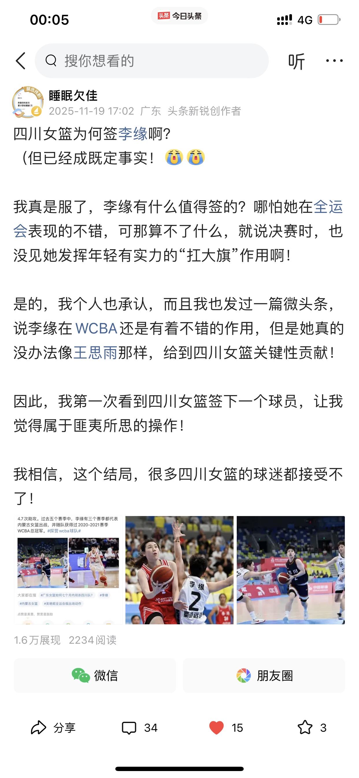我早说四川女篮没必要签李缘! 当时那篇微头条是11月19号发的,我评论区有网友还说李缘值得签,说我不应该这样说! 然而常规赛打了八轮了,谁来告诉我,李缘到底在哪场球起到了关键性的作用? 中国女篮主教练宫鲁鸣说她能“接过中国女篮旗帜”,如此高的评价 然而在四川队,丝毫看不到她有这样子的发挥! 现在好了,李缘就是这样子的表现!那天打北京,他贡献啥了?有人说她防守可以,OK,我也觉得还行,但是一个防守球员,而且还是防守不怎么突出的球员,怎么会得到宫鲁鸣那么高的评价? 完全不符合篮球领域的逻辑! 总之,截止到现在,她在本赛季的四川队没有贡献过关键分数! 当然,我也不全盘否定李缘! 因为,李缘她现在只能做那个锦上添花的角色,从来不是雪中送炭的球员,早已不是当年的李缘,哪怕她还年轻!