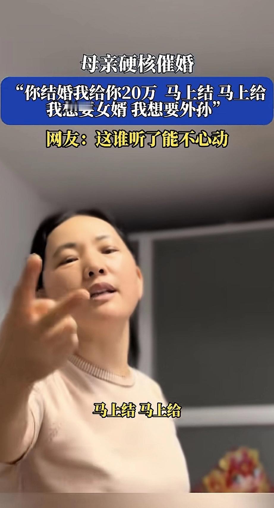 妈妈催婚又出新招,这次直接“放大招”了:“你结婚,我给你20万!马上结,马上给!”说完还补一句:“我想要女婿,我想要外孙!” 这条件,听着确实让人心动。网友都乐了:“阿姨还缺女婿吗?”“这谁听了不迷糊?” 不过玩笑归玩笑,催婚催得再急,感情也不能用钱砸出来。妈妈是真心盼着孩子成家,可幸福终究是自己的选择。希望每个被催的年轻人,都能按自己的节奏,找到对的人。