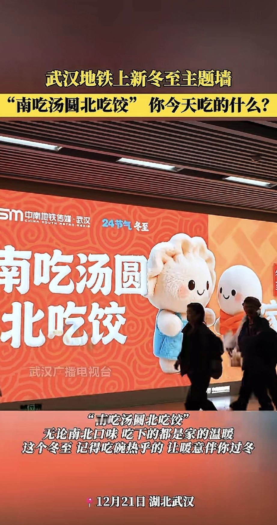 冬至这天,你吃的汤圆还是饺子?武汉地铁新上了一面主题墙,写着“南吃汤圆北吃饺”,一下子把过节的气氛拉满了。 其实不管吃什么,热乎乎的汤圆或饺子一下肚,暖的不只是胃,更是心。这就是咱们中国人过节的温度——团圆、温暖,一口传统味道,一份踏实陪伴。 今天记得吃口热乎的,暖意就能陪你过这个冬天。你那边,冬至吃啥?