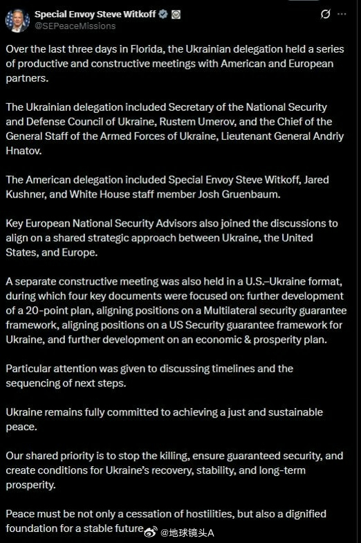 俄乌冲突 迈阿密之密特朗普的特别代表史蒂夫·惠特科夫在美欧乌迈阿密密谋会议后发表了解释性声明。“过去三天在佛罗里达州,乌克兰代表团与美国及欧洲伙伴举行了一系列富有成效且具有建设性的会议。乌克兰代表团成员包括乌克兰国家安全与国防委员会秘书鲁斯捷姆·乌梅罗夫以及乌克兰武装力量总参谋长安德烈·格纳托夫中将。美国代表团成员有特别代表史蒂夫·惠特科夫、贾里德·库什纳和白宫工作人员乔希·格林鲍姆。欧洲几个带头大哥的国家安全顾问也参与了讨论,旨在协调乌克兰、美国和欧洲之间的共同战略方针。此外,还举行了一场单独的建设性美乌双边会议,会上重点讨论了四份关键文件:进一步完善20点计划、协调多边安全保障框架的立场、协调美国对乌克兰安全保障框架的立场,以及进一步制定经济发展与繁荣计划。会议特别关注了后续步骤的时间安排和先后顺序。乌克兰仍完全致力于实现公正且持久的和平。我们的共同优先事项是制止杀戮、确保有保障的安全,并为乌克兰的重建、稳定及长期繁荣创造条件。和平不应仅仅是停止敌对行动,还应成为稳定未来的坚实基础。乌克兰高度赞赏美国的领导作用与支持,以及在这项重要工作的后续阶段与伙伴们持续开展的密切协调。”迈阿密之密是啥?是破落欧带着炮灰乌,去找大户美,力求一个“和平”之后的炮灰乌能够获得金钟罩,破落欧的目的是,如果有金钟罩,炮灰乌还能继续发挥炮灰作用,继续成为威胁和削弱俄罗斯的工具,成为破落欧的挡土墙,确保欧洲拥有话事权不被排除多极之外。炮灰乌的目的呢?除了想着第聂伯河以西不被占领,有人继续打钱,其他想法都是多余。大户美想法那就多了,尽一切可能两头通吃,破落欧还有油水可榨,还能为它提供筹码去敲诈俄国人,昨天提了一嘴G2,明天还可以聊一聊G3,万一真有人上当了与它一块并肩呢。总之,只要确保大户人家有钱可捞,咋都行。美国斩杀线美对叙利亚持续5小时猛烈轰炸