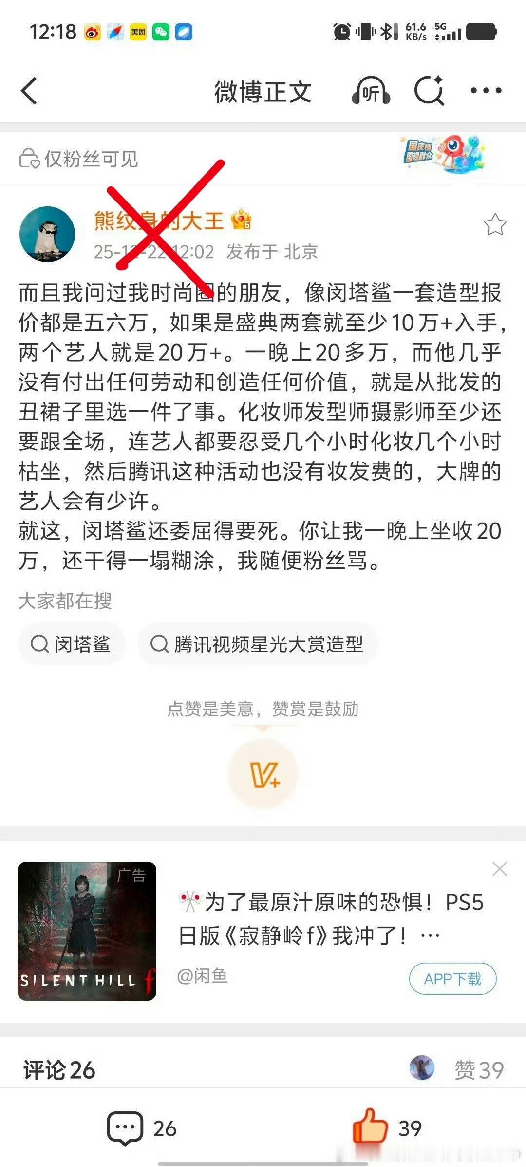 闵塔鲨辟谣赵露思星光大赏礼服传闻,但也有人说他一晚上收20多w啥事都不干,这是真