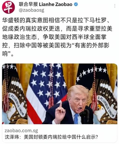 《联合早报》这逼挺坏?美国入侵委内瑞拉,硬要问对中国有什么启示,这不怀好意的劲隔着几千里我都能闻得到。 先说说美国对委内瑞拉的那套操作,哪是什么 “入侵” 的表面功夫,全是往死里掐的阴招。就在 12 月初,美国刚宣布制裁马杜罗妻子的一堆亲属,扣了个 “腐败贩毒” 的帽子,转头就在南加勒比加了军事部署,把进出委内瑞拉的油轮都给 “封锁” 了。这还不算完,11 月刚把一个叫 “太阳集团” 的组织列为 “恐怖组织”,委内瑞拉外交部直接骂这是 “荒谬的谎言”,就是为了找借口干涉内政。 说白了,美国就是盯着委内瑞拉的石油。要知道委内瑞拉的石油出口三分之二都往中国运,今年 3 月美国还想给买委石油的国家加 25% 关税,明摆着就是想掐断中委贸易线。 可折腾了大半年,委内瑞拉不仅没垮,反而在北京开了经济特区推介会,直言要学中国经验搞发展,连航天合作、卫星研制都跟中国签了协议。这霸权主义的戏码,看得人都腻了。 就在这节骨眼上,《联合早报》跳出来问 “对中国有什么启示”,这坏心思真是藏都藏不住。合着美国破坏国际规则、欺负小国,不去骂霸权,反倒盯着中国要 “启示”? 是想撺掇中国要么蹚浑水,要么背上 “不管不顾” 的骂名?还是觉得中国会跟他们似的,看美国脸色行事?这算盘打得,太平洋对岸都能听见响。 其实啊,这事儿最该受 “启示” 的是新加坡。咱翻翻新加坡的外交账本就清楚了,他们外长维文天天把 “维护主权”“反对侵略” 挂嘴边,说什么 “小国存亡系于国际法”,俄乌冲突时还跟着制裁俄罗斯,理由是 “不能开侵犯主权的先例”。 结果到了美国封锁委内瑞拉这儿,新加坡立马哑巴了,连句谴责都没有。这双标玩得也太溜了吧? 要知道新加坡自己就是弹丸小国,李光耀当年定下的外交底线就是 “不能让大国随便欺负小国”。 可现在美国把 “强权即公理” 的戏码演到家门口,新加坡要是真信自己那套 “原则”,早该站出来说话了。毕竟今天美国能随便给委内瑞拉扣帽子、封油轮,明天要是看新加坡不顺眼,会不会也找个借口搞制裁?这道理跟明镜似的,还用别人给启示? 反观中国,根本犯不着看谁的脸色,选项多到能挑花眼。先说 “撒手不管” 这条路,那也是底气十足。2024 年中委贸易额都涨到 64 亿美元了,同比涨了 52.5%,还签了相互保护投资协定,委内瑞拉的经济特区全靠中国技术和资金撑着。 就算换个领导人又能怎样?看看阿根廷的米莱就知道,上台前把反华调子唱得多高,结果今年大豆出口创 6 年新高,881 万吨大豆全靠中国市场消化,还不是乖乖跑来续货币互换协议。 委内瑞拉谁上台都得认中国这个合作伙伴,不然石油卖不出去,经济特区建不起来,国家根本玩不转。 要是想站出来主持正义,中国更有底气。中委现在是 “全天候战略伙伴关系”,全球也就六个国家有这待遇。联合国里每次美国提制裁委内瑞拉,中国都坚决反对,外交部直接喊话 “美国赶紧废除非法制裁”。 真要动真格的,中国能联合金砖国家新开发银行给委内瑞拉输血,能用人民币结算绕开美元封锁,还能借着 “一带一路” 帮委内瑞拉建基础设施。美国想靠封锁施压?门儿都没有。 其实中国的选择从来都不是二选一,而是看自己的节奏。现在中委合作早就超出石油范畴了,从数字经济到电动汽车,从月球科研站到农业技术,早就绑在一条船上了。 美国再怎么折腾,也改变不了中委的互补性,中国需要能源,委内瑞拉需要发展,这是市场规律,不是霸权能打断的。 倒是新加坡得好好琢磨琢磨,自己天天喊的 “国际规则” 到底是拿来当遮羞布,还是真当立国之本。要是连美国明目张胆的霸权都不敢反对,那所谓的 “原则” 不就是自欺欺人?哪天马六甲海峡的利益冲突了,美国会不会也给新加坡扣个帽子?这才是真该好好想想的 “启示”。 说到底,《联合早报》这提问就是没安好心。可他们忘了,中国早就不是当年那个任人拿捏的主儿了。 不管是撒手不管稳赚不赔,还是主持正义硬刚霸权,中国都有自己的章法。倒是新加坡要是再揣着明白装糊涂,早晚得吃大亏。这霸权主义的警钟,先该敲醒的是那些嘴上喊原则、实则看风向的主儿。