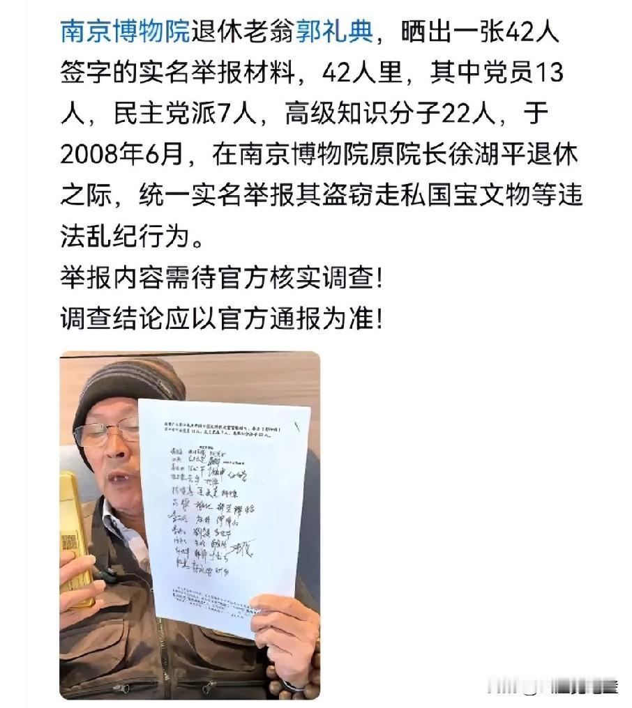 个省级博物院,有42个人联名举报徐湖平院长私吞文物,竟然没有下文。一个博物院,总共才能有多少个职工,42人,应该是多数了 说明不是个别职工不满院长,而是大部分职工认为院长存在问题,这42人已经是博物院的多数了。 实名举报必须有充分的理由,才能被受理,如果举报内容不属实,捏造事实诬告他人的, 后果很严重,这42名职工敢于实名举报,一定是掌握了确凿的证据,而徐院长至今毫发无损, 这说明举报的内容大部分属实,徐院长能够全身而退, 说明他背后还有大人物撑腰,或者他手里还掌握着大量珍贵文物。