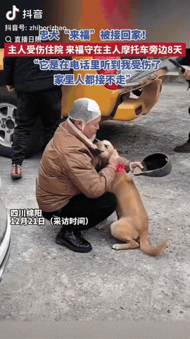 四川绵阳,主人骑摩托车受伤住院,没想到狗狗“来福”听到这个消息,它马上跑出去找主人,结果只找到他的摩托车,于是它在主人的摩托旁边守了8天,主人知道这事后直接提前出院和狗狗相聚。 信息来源:直播日照 这事儿发生在2025年12月1日那天,地点在四川绵阳市平武县一家兰花店门口。 何国章骑着那辆旧摩托,准备下山去朋友的面馆给“来福”买狗粮,谁知就在山脚的一段弯道摔车,直接被救护车拉去医院住院治疗,没办法,光顾着救人,摩托就丢在了兰花店边。 当天,“来福”跟着老婆去放羊,突然闻到一股熟悉的汽油味,回头一看,主人不在了,它就嗅着味道冲出院子,沿着山路一路找。 它先跑到工地、又到小卖部,哪儿都没见到主人,只在兰花店门口认出了那辆摩托。 就这么趴下了,白天黑夜一起守,十二月的风可冷了,它都不搭理家人和好心人递过去的棉衣和饭碗。 从12月1日到8日头几天,附近几乎没人注意它。 直到博主杨先生路过,看到它一直蹲在车旁,才拿出手机记录下来,顺便跟街坊们凑热闹。 大家被它的忠诚暖到了,就自发每天给它送狗粮、送水,还用纸箱给它搭了个小窝,防止冻伤。 这段守车日常被上传网络后,迅速吸引了几十万网友围观和转发,“真·忠犬八公在线撒狗粮”“暖哭了”“这才是铲屎官的回报”……弹幕刷成一片。 等到12月19日早上,何国章在病床上辗转从网友那儿才知道“来福”守车的故事,他一听就心疼得不得了,扭着还没彻底好的伤,直接提前出院。 那天上午,杨先生还开启了直播,数千人看着何国章慢慢走到兰花店门口。 只见“来福”一看到主人,立马屁颠屁颠地扑上来,又蹭又舔,尾巴摇成了电风扇。 主人眼眶烫得直发热,一把将它抱进怀里:“别冻着,赶紧回家。” 听着围观的人一阵掌声和赞叹,温度瞬间飙到沸点。 这事儿告诉我们:狗狗真心把主人当天,当世界,只要你对它好,它就能用一辈子来守护。 也提醒每个铲屎官,出门前多留个联系方式,万一意外,最怕的就是它们像“来福”这样焦虑守候。 万物皆有灵,这狗狗是世界上最忠诚的动物,对主人不离不弃,默默守护,它懂得感恩主人,其实它什么都懂,只是不会说话而已。