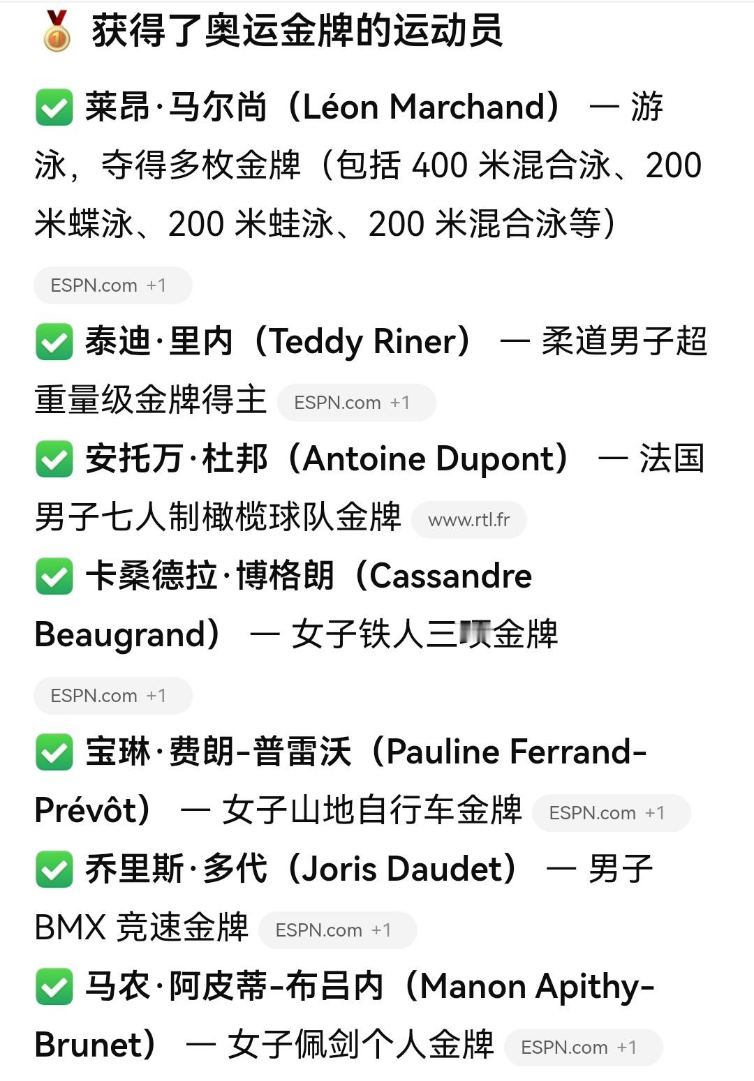 去年欧洲体育评选的法国年度运动员排行榜前十:7个巴黎奥运会金牌得主+世界杯冠军+文班亚马+小fefe1.莱昂·马尔尚2.泰迪·里内 3.安托万·杜邦4.费利克斯·勒布伦5.卡桑德拉·博格朗6.宝琳·费朗-普雷沃7.乔里斯·多代8.维克托·文班亚马9.马农·阿皮蒂-布吕内10.西普里安·萨拉赞