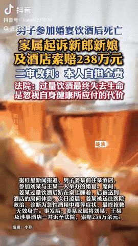 北京,一男子参加婚宴饮酒后死亡,事后,男子的家属将新郎一家和酒店告上法院,并索赔238万元,一审法院判决新郎和酒店分别承担20%和10%的责任,最后二审来了个大反转,直接改判:本人自担全责。 信息来源:逐浪新闻 话说这件事不只是一桩婚宴悲剧,更是一场法庭上的“迷之反转”。 先是一审判主办方和酒店要背点锅,再看二审,直接一脚把锅还给了自己喝多的姜某。 下面给大家唠唠来龙去脉,保证你看完也能跟朋友侃。 10月28日中午,37岁的姜某到北京大兴一酒店“黄山厅”参加生意伙伴刘某的婚宴。 宴席上白酒、饮料都摆满桌,姜某是酒水老板,自己动手豪爽地开喝,周围女士孩子几乎不碰白酒,他又找不到“一杯对手”,便不断自斟自饮。 直到下午3点10左右,他一头倒在桌上鼾声大作,旁人抬到旁边的“百乐园”套房里,大家以为他只是醉得厉害,先去继续参加晚宴了,房门也没关严。 晚上6点半,新郎又去看过他一次,姜某继续睡,没啥异样;两小时后,酒店保安巡房看他还躺那,也只是锁了门就走。 直到11点17分,保洁大姐来清扫房间,看到他满脸发白、呼吸微弱立马掀被子,紧急拨打120。 可惜救护车赶到时已无意识,次日一早,医院诊断因酒精中毒并发吸入性肺炎、呼吸衰竭,最终因窒息抢救无效身亡。 家属一听儿子是在婚宴酒店出事,又没人劝酒、没人陪护,气炸了——直接把刘某、王某夫妻和酒店全都告了,上诉索赔近238万元。 第一审法院也没留情面,认定主办方和酒店没尽到安全保障义务,判刘某夫妇承担20%、酒店承担10%的责任。 剩下70%归姜某本人承担,但也得赔偿几十万给家属。 然而到了2024年12月9日,二审法院在北京市第二中院的公开判决书里来了个大反转:认定婚宴期间无逼酒、无劝酒,姜某是完全民事行为能力人,自愿喝醉并因自身酒量过限导致不幸,婚宴方和酒店救助也算及时合理,二者与死亡结果之间不存在直接因果,依法不该承担赔偿责任。 于是撤销了一审对新郎新娘和酒店的赔偿判令。 即便如此,刘某夫妻还是赶紧跟家属和解,二审调解时自掏腰包补偿1万元;酒店也出于人情面子给了10万元。 最后这场官司算是以11万元的人道慰问性赔偿收场。 整个案子告诉我们两件事:一是聚会喝酒请务必找个伴,别把自己丢那儿“solo”喝到昏;二是组织者和场地方的安全保障义务有个“合理范围”,并非谁倒地谁就能揽责。 总之,生命安全第一,作为成年人喝酒要适可而止,不能喝醉,醉酒容易误事,甚至丢掉性命。