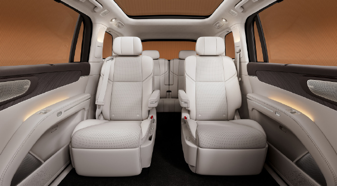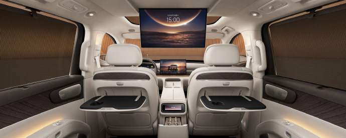 提前看看零跑 D19 的内饰。前排还是单中控屏设计、标配主驾头枕音响、单无线充电。二排应该是双零重力座椅,支持 120° 的躺姿、有两个折叠小桌板、8.1L 的冷暖冰箱和 6 英寸的后排娱乐屏幕。三排座椅支持电动折叠、加热、带遮阳帘,全车软包面积有 25m²。汽车黑科技零跑d19