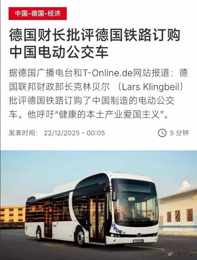 德国是是典型的“即当又立”,既想要清洁的能源,又不想用中国的电动汽车 德国财政部部长批评德国铁路订购中国电动公交车,认为德国铁路应该“健康的本土产业爱国主义” 德国的环保意义硬是把德国的核电站“闹腾”得拆了,现在德国铁路订购了中国的电动公交车,德国又不愿意了。这是典型的既当又立。