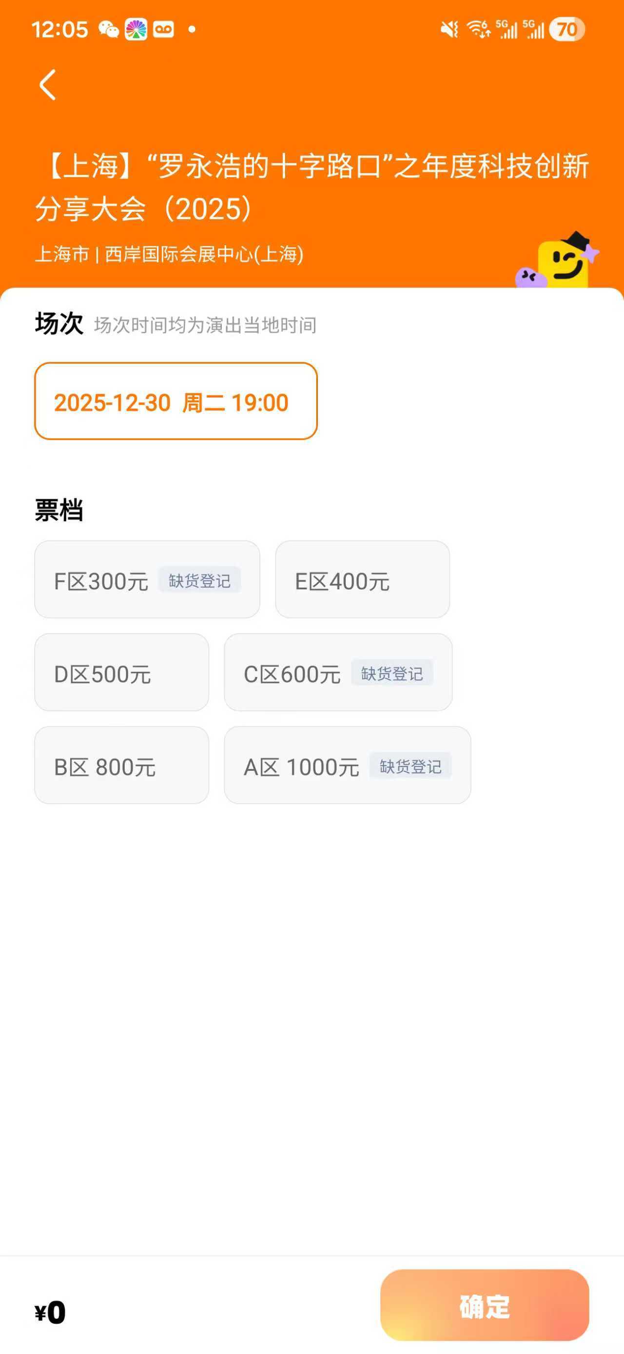 【罗永浩年度科技大会千元票秒光】 12月22日,“2025年度科技创新分享大会”门票正式在大麦App开售,其中最高档位1000元门票瞬间售罄,其余300元至800元不等的五档门票也迅速告急。